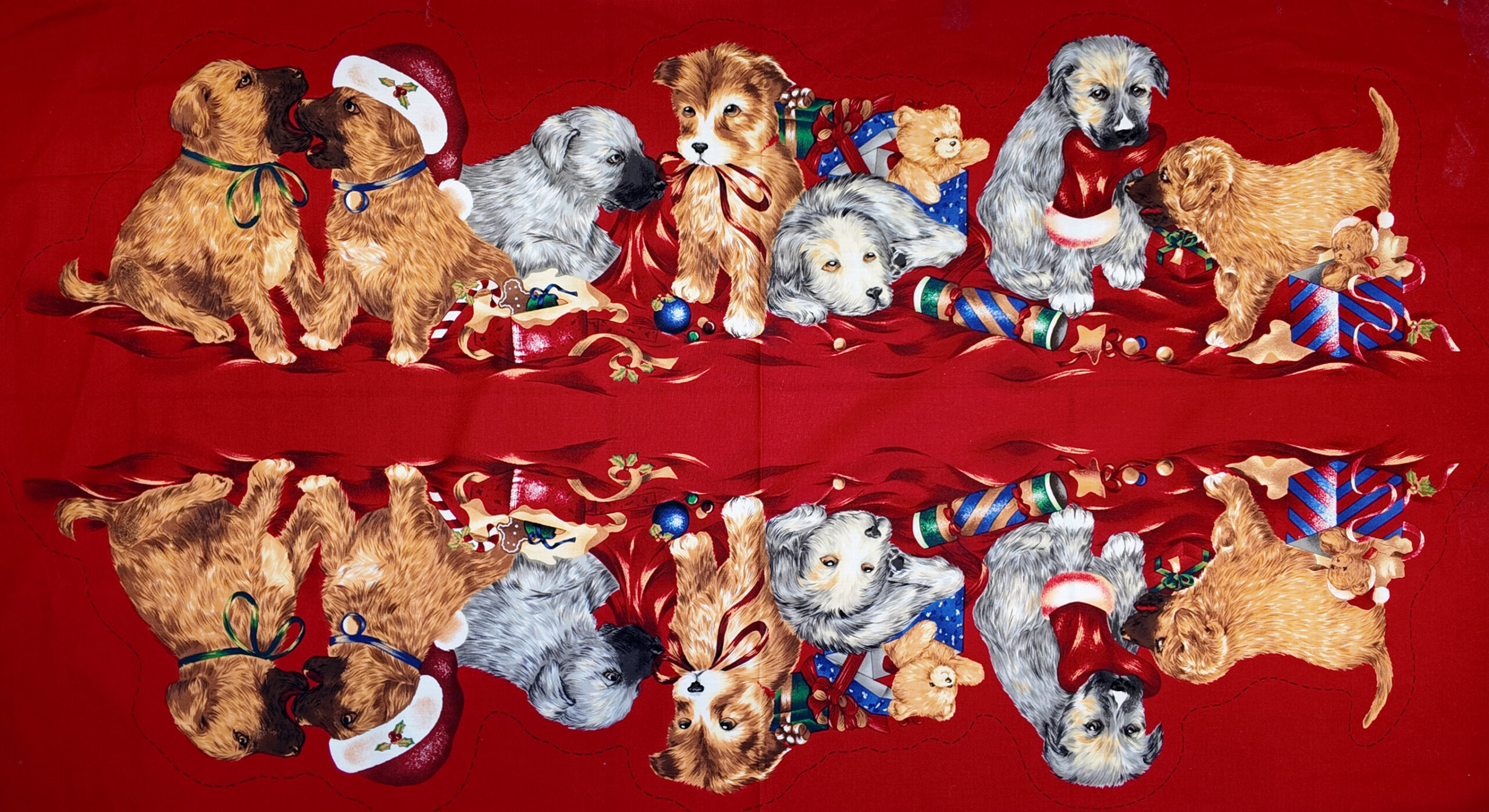 Une farandole de chiots joyeux s’ébattant sur un fond rouge profond, entourés de cadeaux, peluches et friandises de Noël. Leurs regards tendres et leurs rubans colorés évoquent la tendresse et la magie simple des fêtes d’hiver.