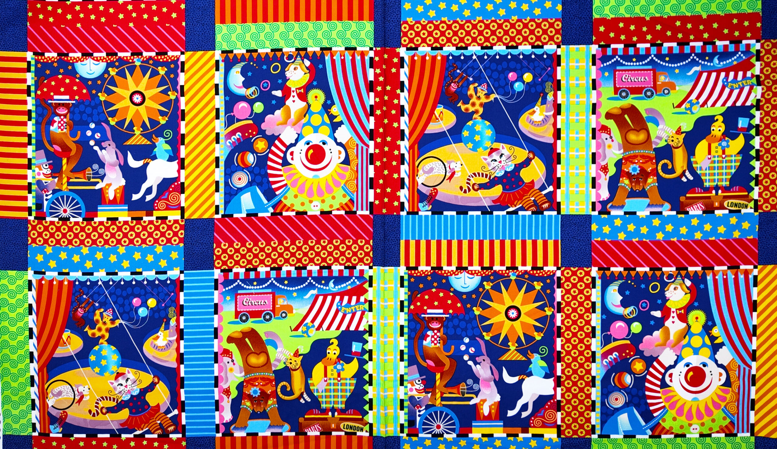 Explosion de couleurs et de rires sous le chapiteau : clowns, animaux et manèges se mêlent dans une symphonie joyeuse. Ce tissu vibrant capture toute la magie du cirque avec ses rayures, étoiles et jeux de lumière éclatants