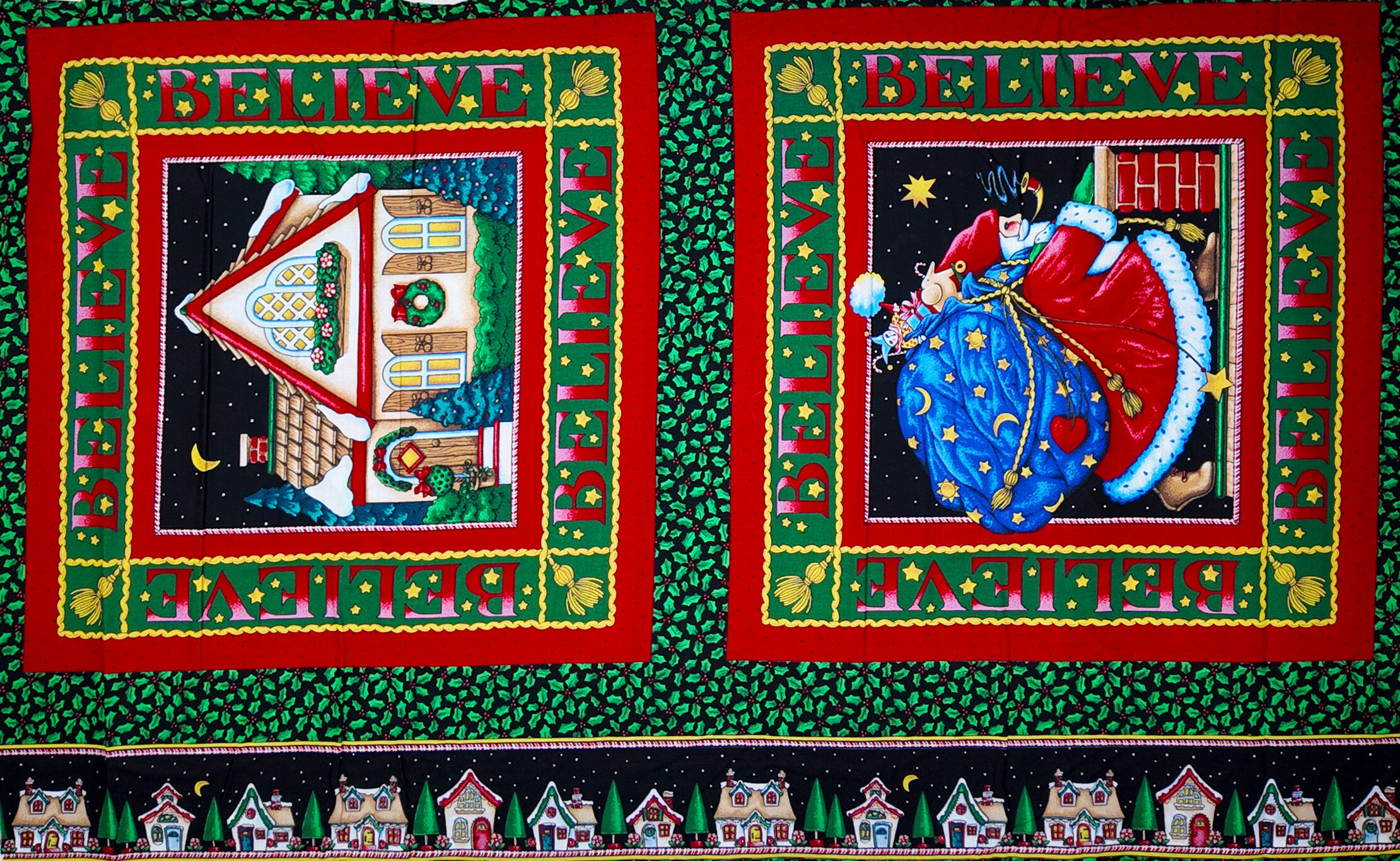 Tissu de Noël enchanteur où la maison illuminée et le Père Noël apparaissent dans des cadres bordés de houx. Le mot “Believe” s’y répète comme une promesse d’émerveillement et de rêve étoilé.