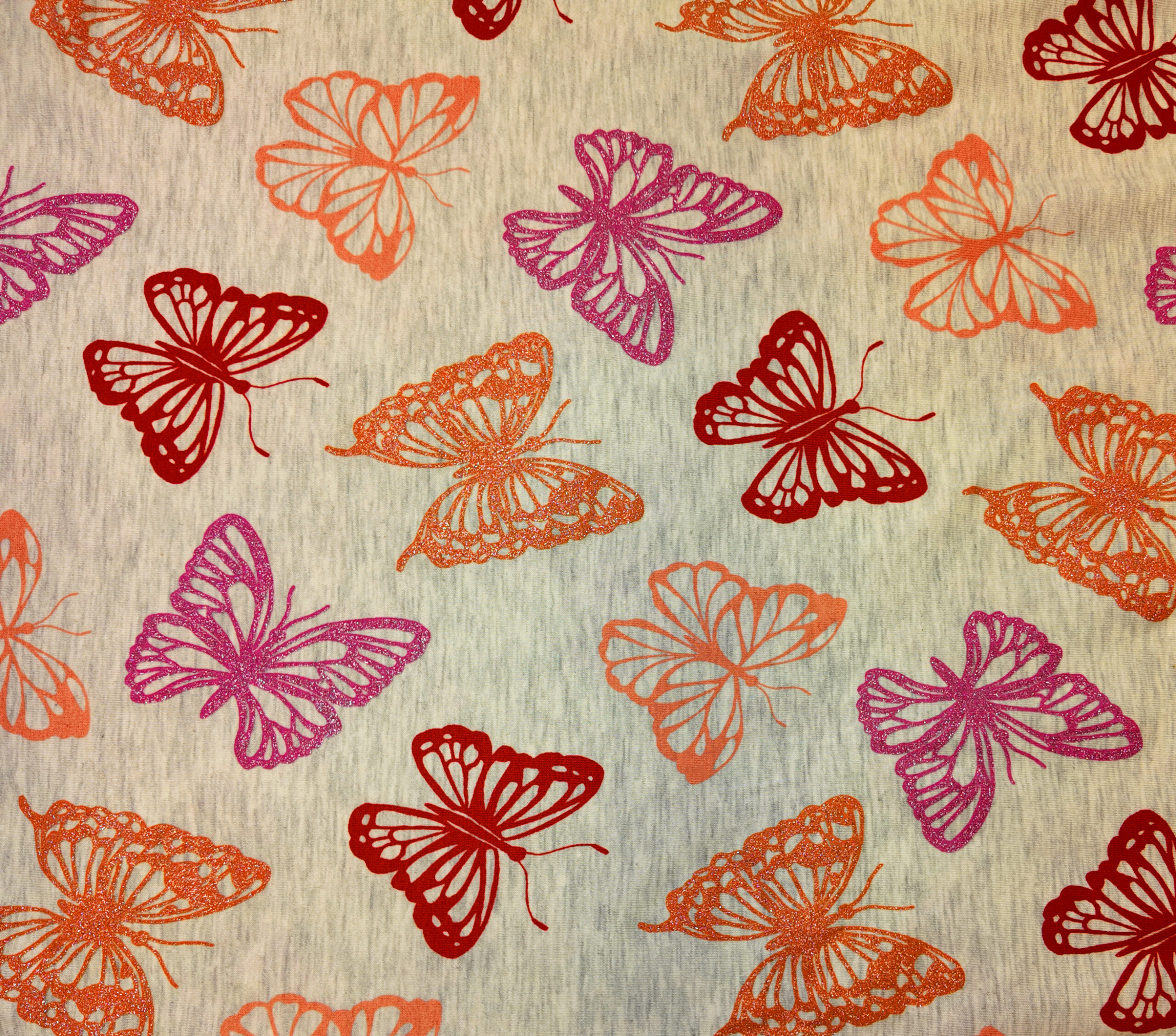 Tissu gris clair animé de papillons rouges, orange et violets. Un imprimé lumineux et poétique qui évoque la légèreté du vent et la grâce du mouvement.