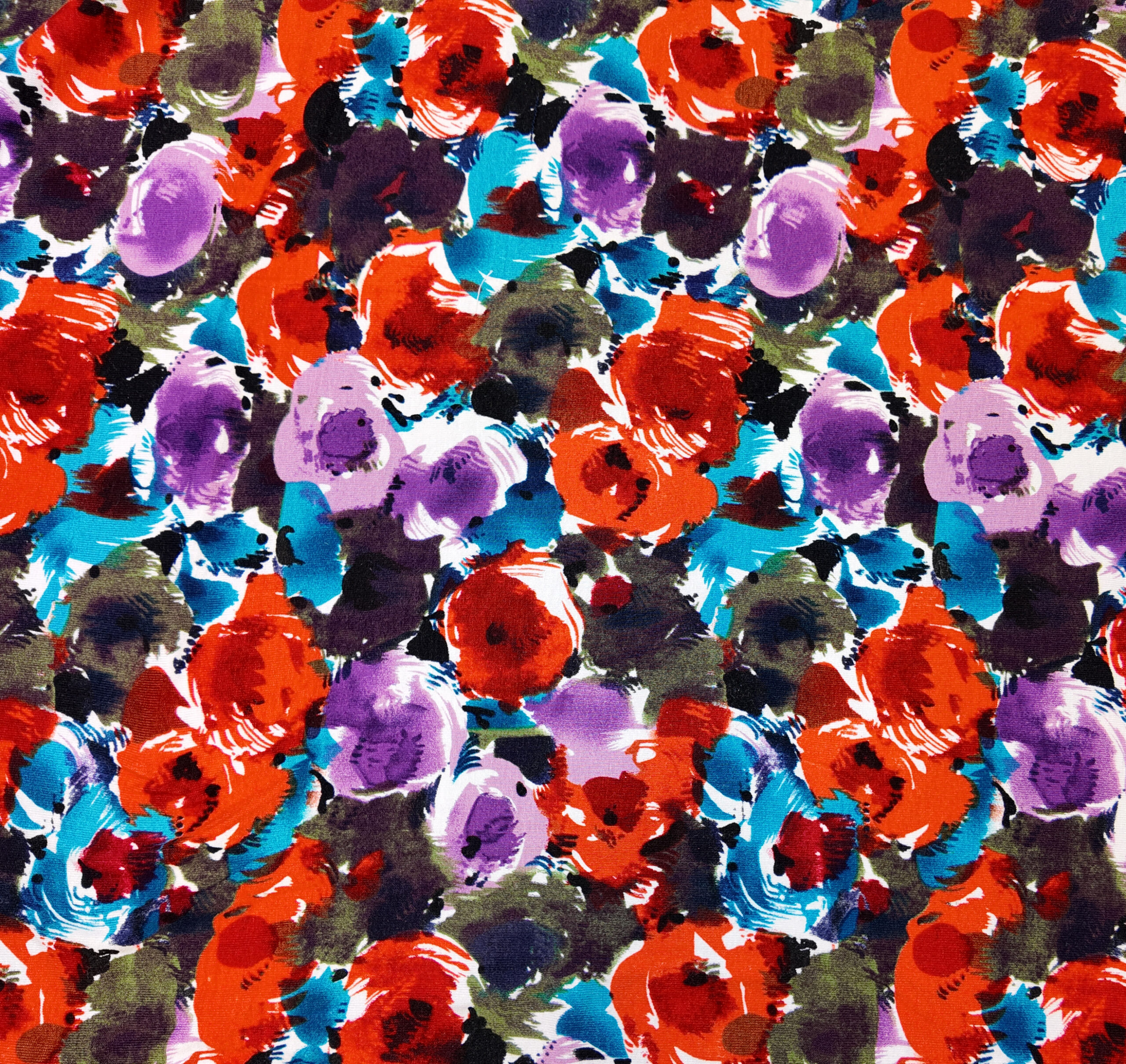 Tissu éclatant mêlant des touches de rouge, violet, turquoise et noir dans une composition picturale vibrante et expressive.