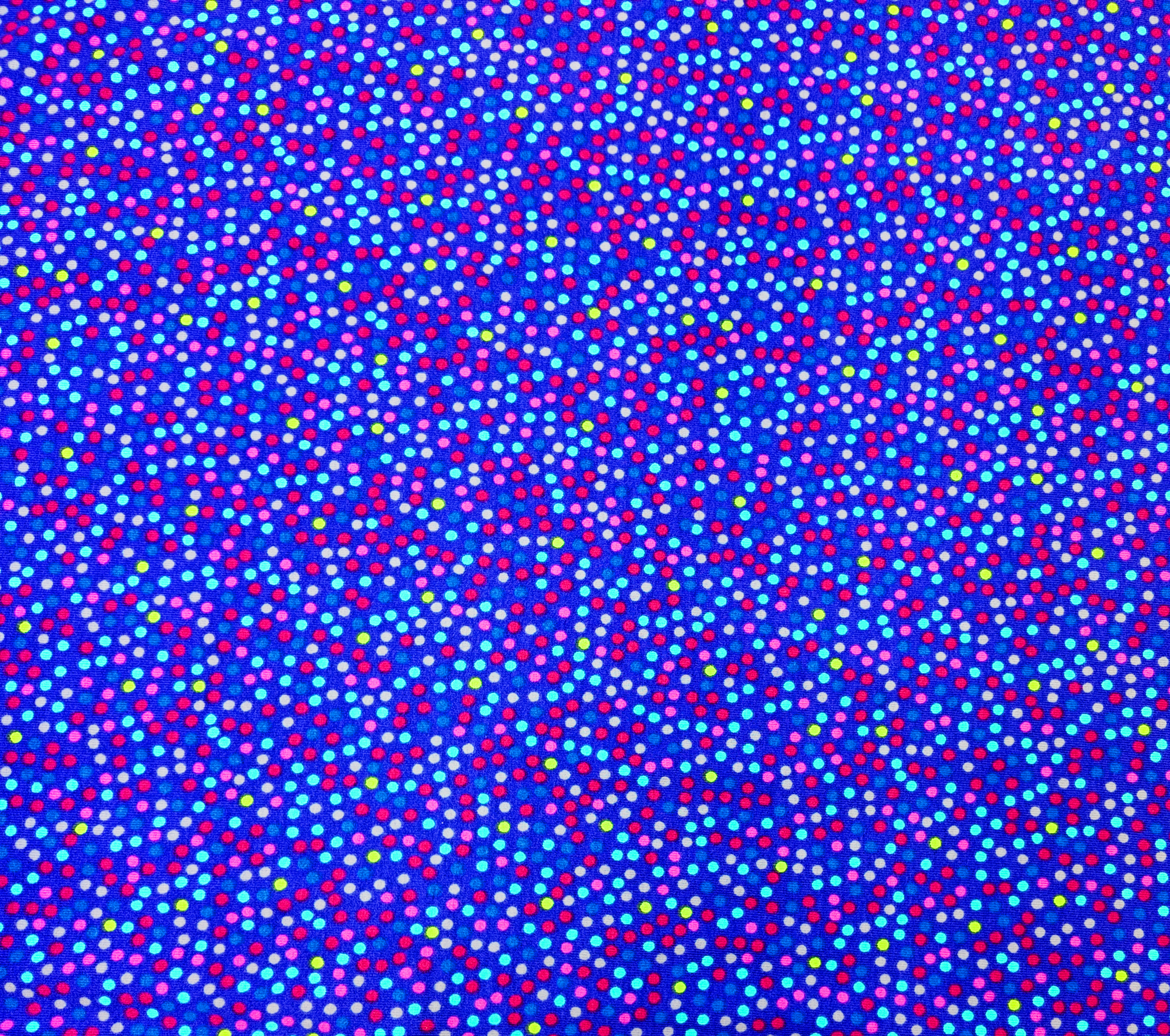 Fond bleu intense couvert de points multicolores, un motif pétillant et joyeux aux accents festifs.