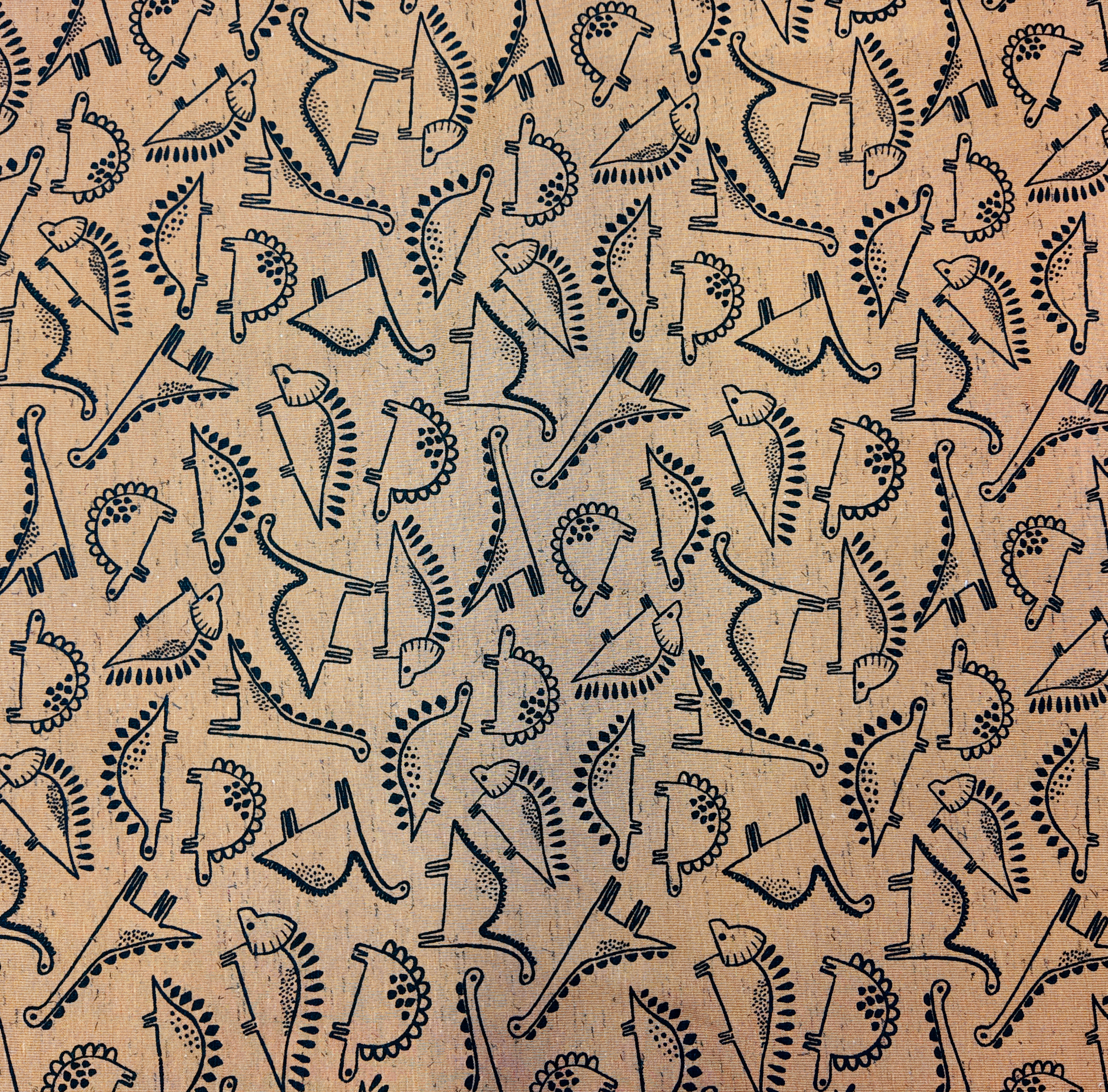 Fond beige recouvert de silhouettes d’animaux stylisées en noir, un esprit artisanal et ethnique.