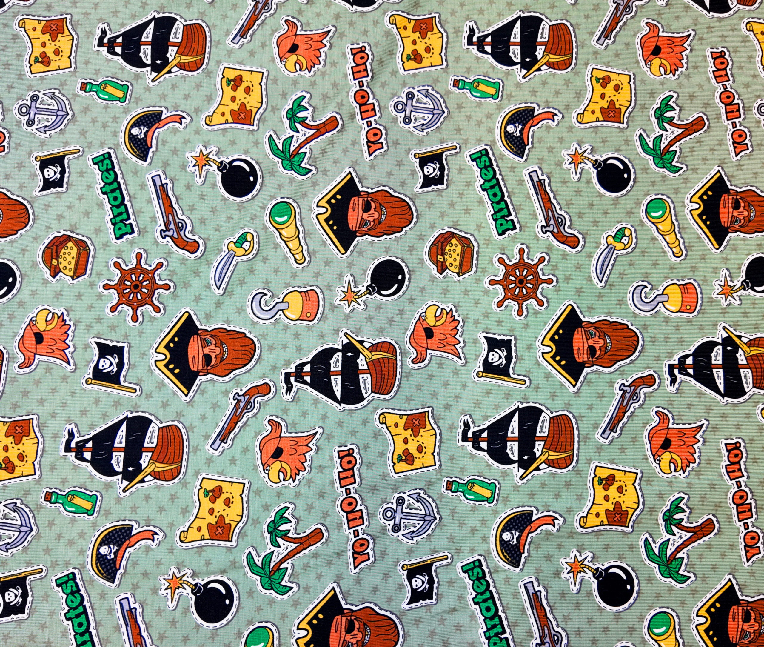 Motif amusant de pirates, cartes au trésor, ancres et perroquets sur fond vert clair, un univers d’aventure et d’humour.