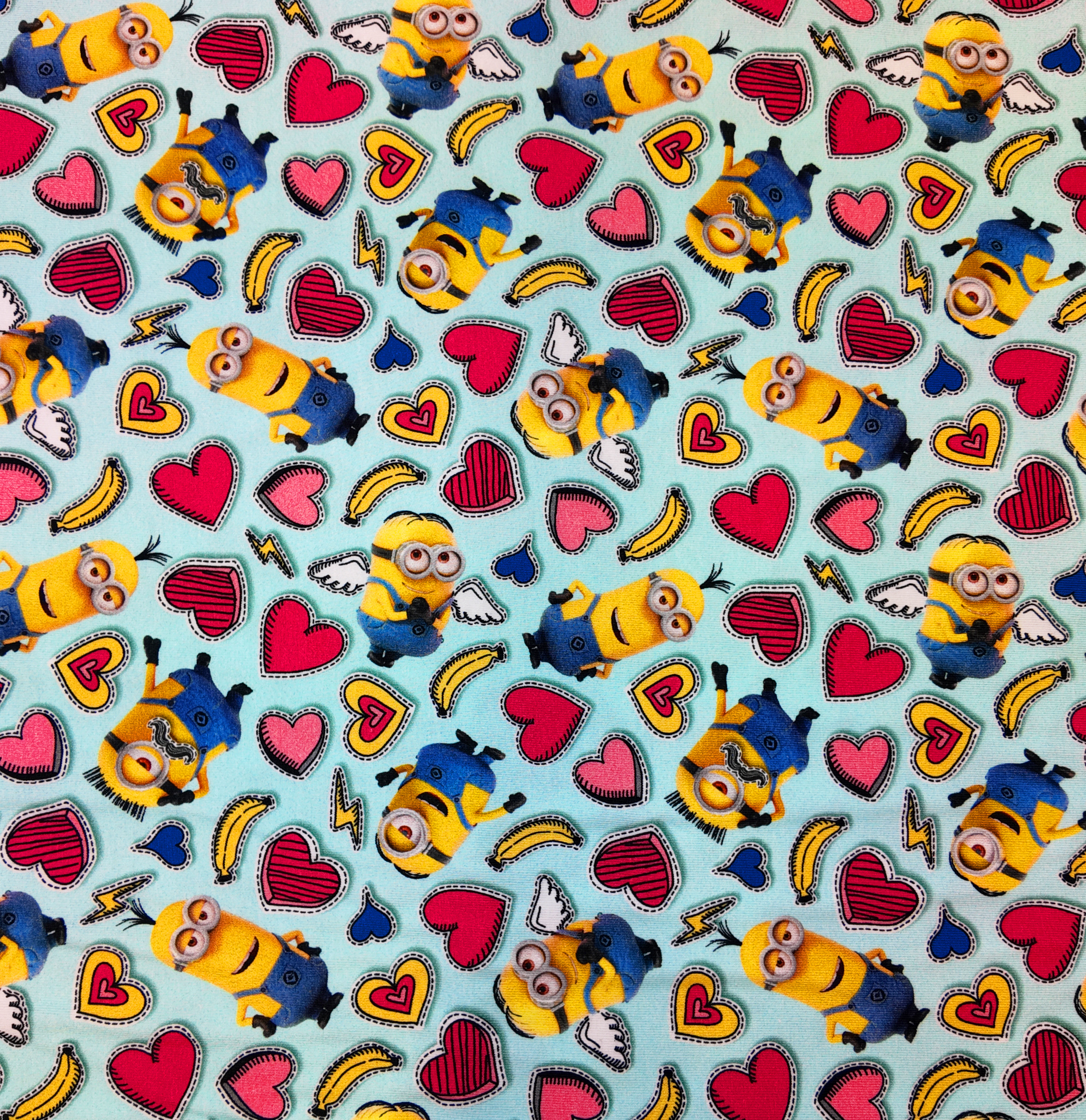 Fond turquoise peuplé de petits personnages jaunes entourés de cœurs et de bananes, une ambiance espiègle et joyeuse.