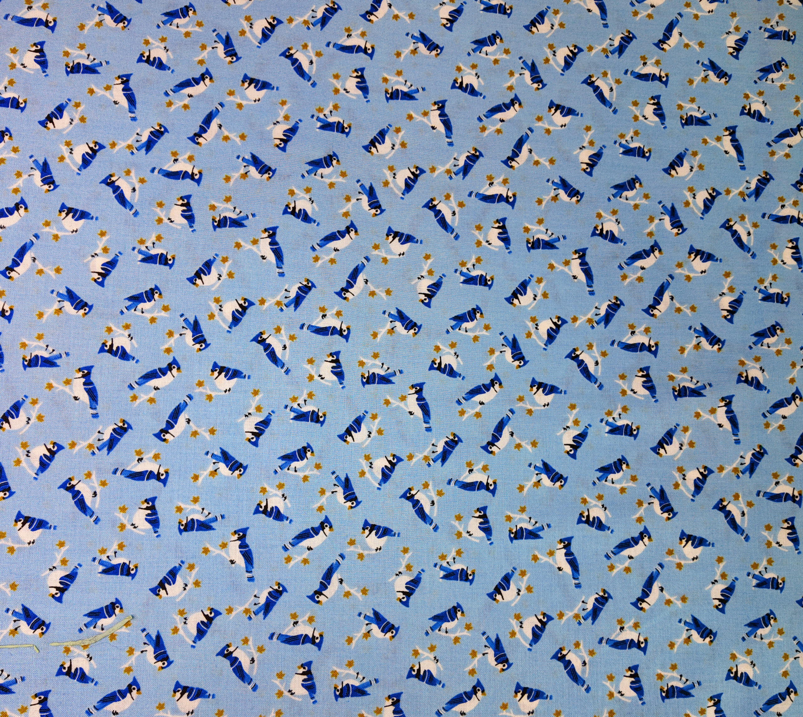 De petits oiseaux bleus virevoltent parmi des feuilles dorées sur un ciel azuré. Ce tissu léger inspire la liberté et la douceur des beaux jours.