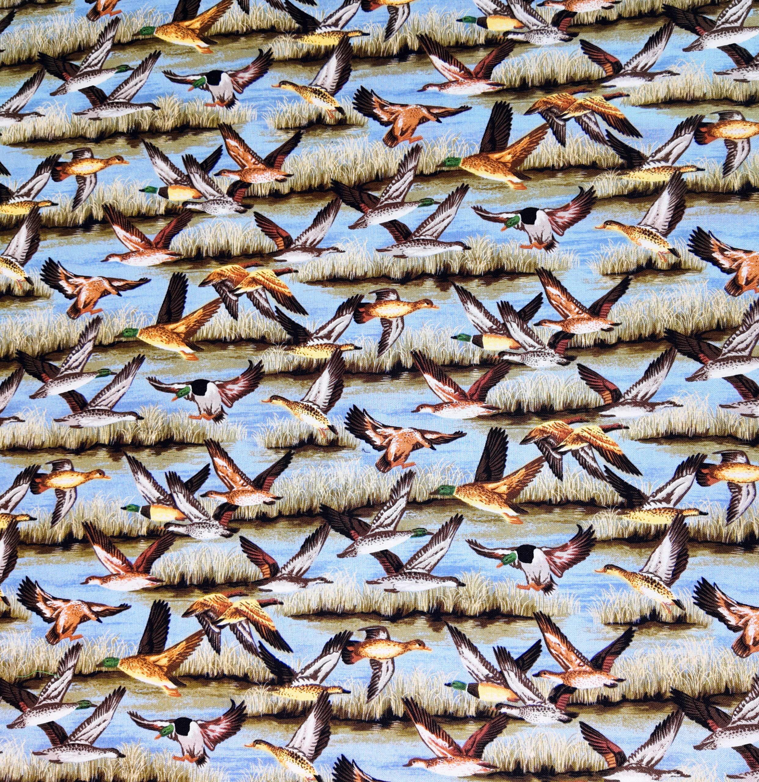 Une nuée de canards survole un paysage de marais dorés sous un ciel clair. Ce tissu respire la liberté et le souffle du grand air.