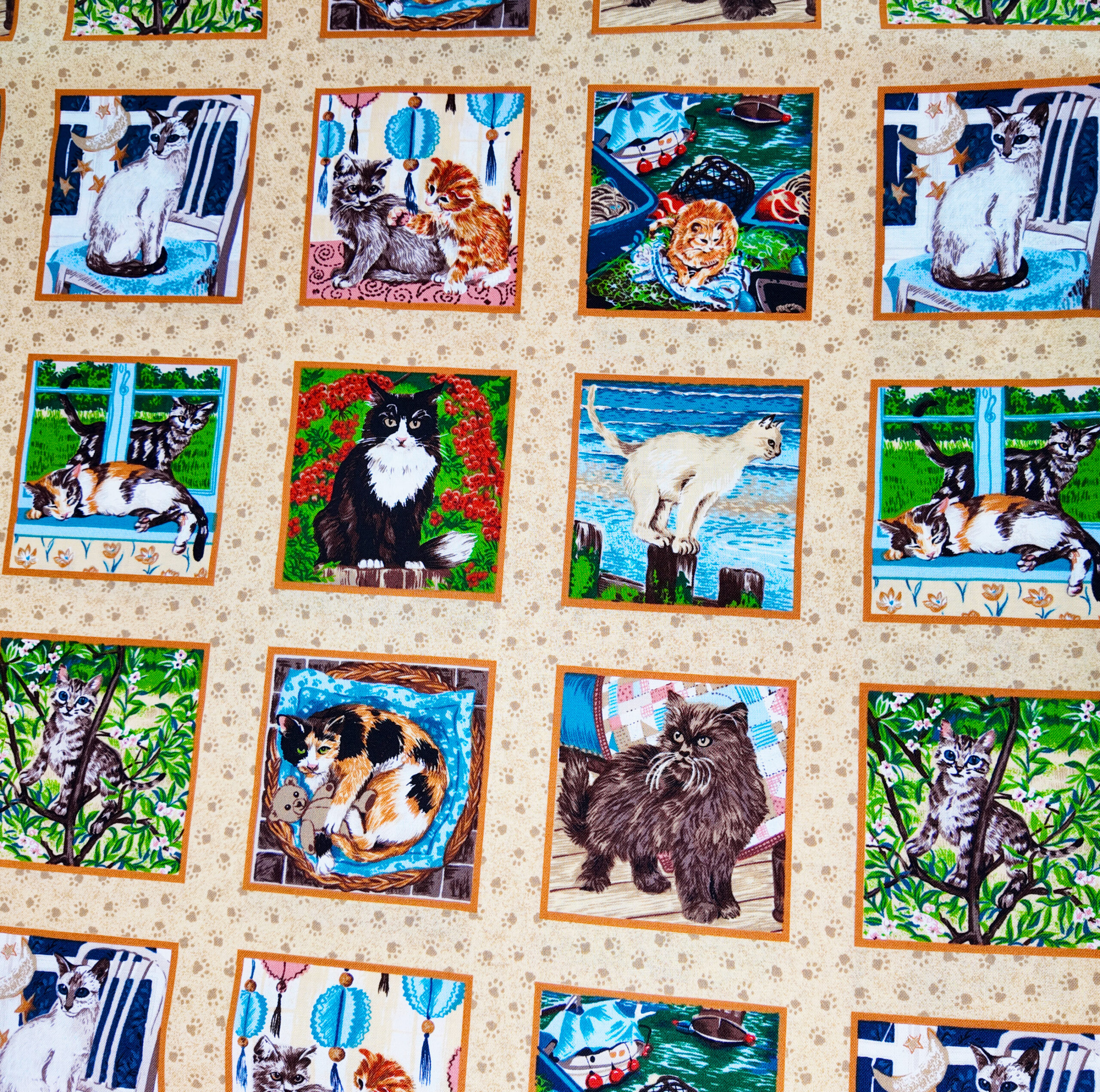 Tableaux miniatures de chats au bord de mer et à la campagne, sur fond beige à empreintes douces. Une ode à la tendresse animale.