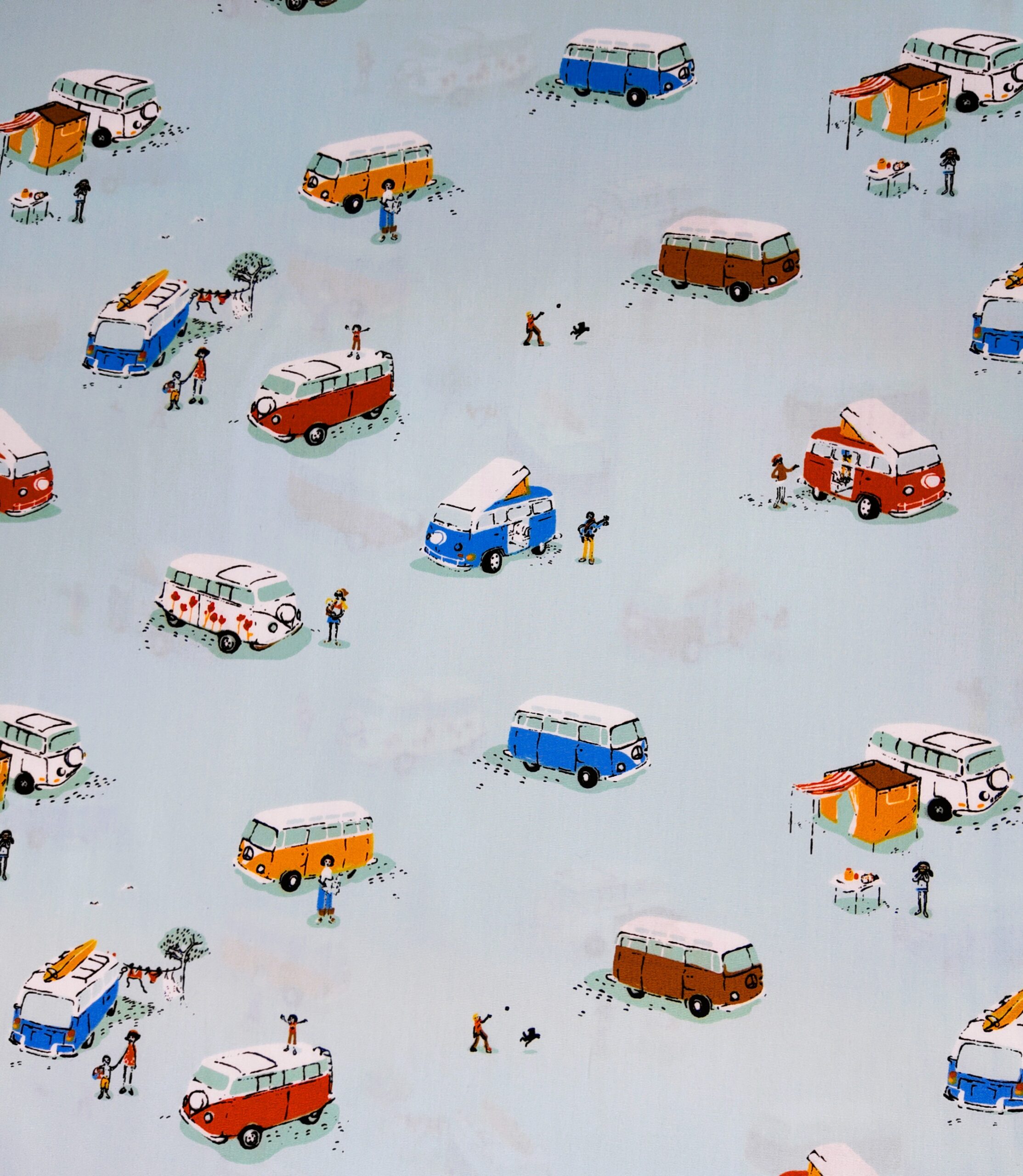 Une escapade bohème s’esquisse : combis colorés et scènes de plein air sur fond pastel. Ce tissu respire la liberté, les voyages d’été et la douceur des routes ensoleillées.