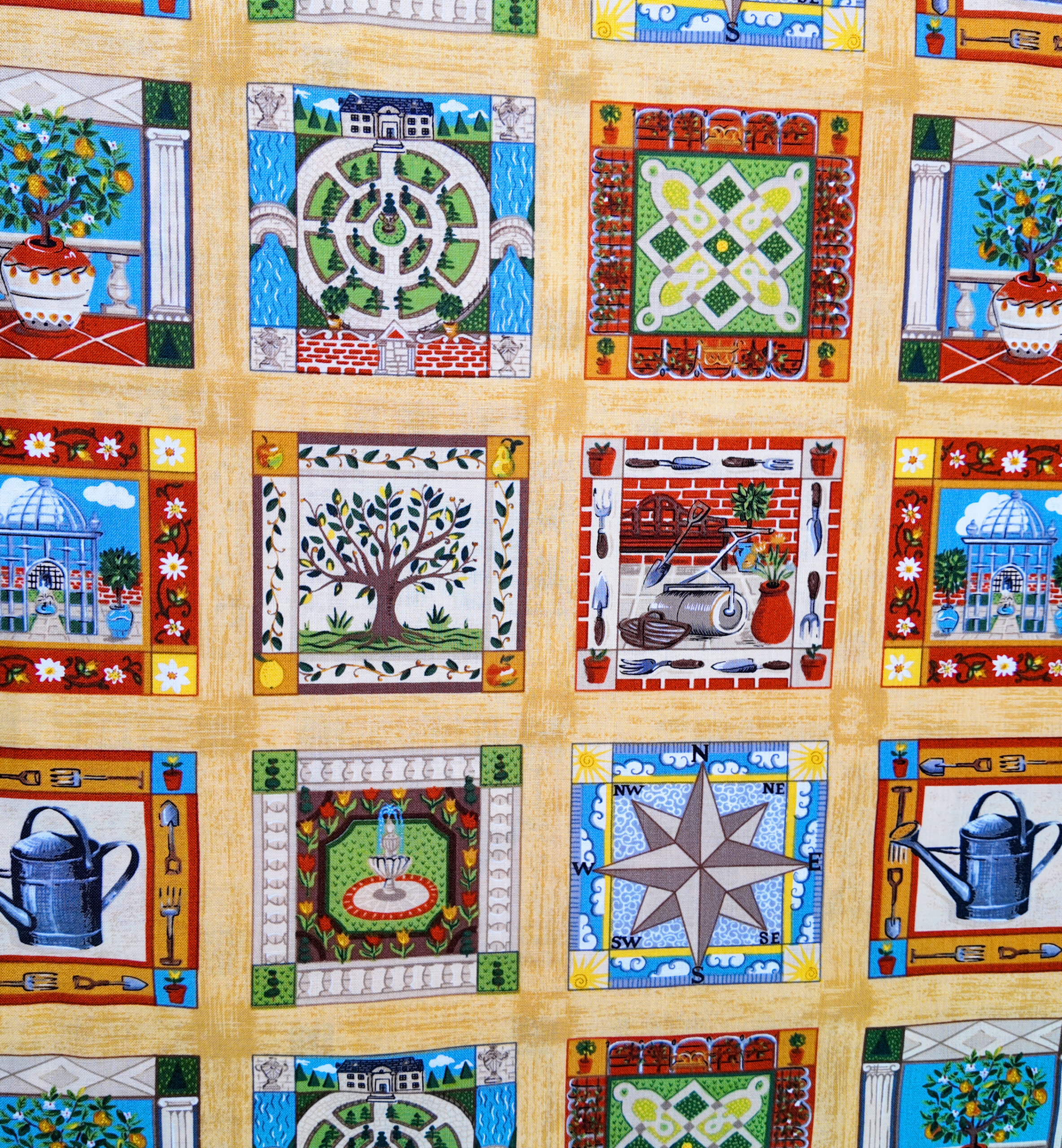Un patchwork champêtre et raffiné : fontaines, orangers, outils et jardins ornent des carrés colorés. Ce tissu rayonne d’harmonie, rappelant les terrasses fleuries d’une villa méditerranéenne.