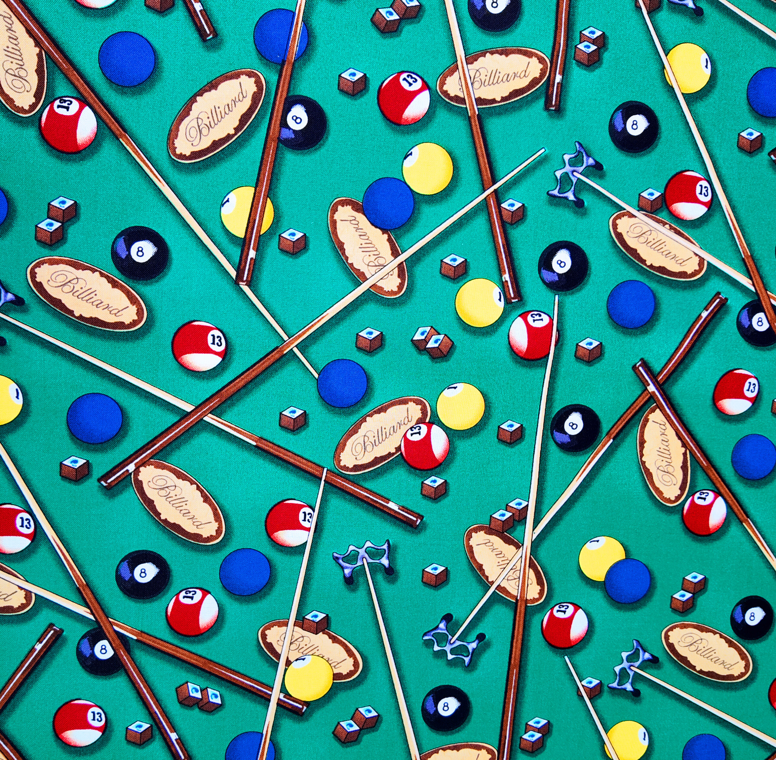 Sur un vert profond, les billes de billard et les queues se croisent dans un jeu de lumière vif. Le tissu évoque l’élégance d’un salon de jeu et le plaisir de la concentration.