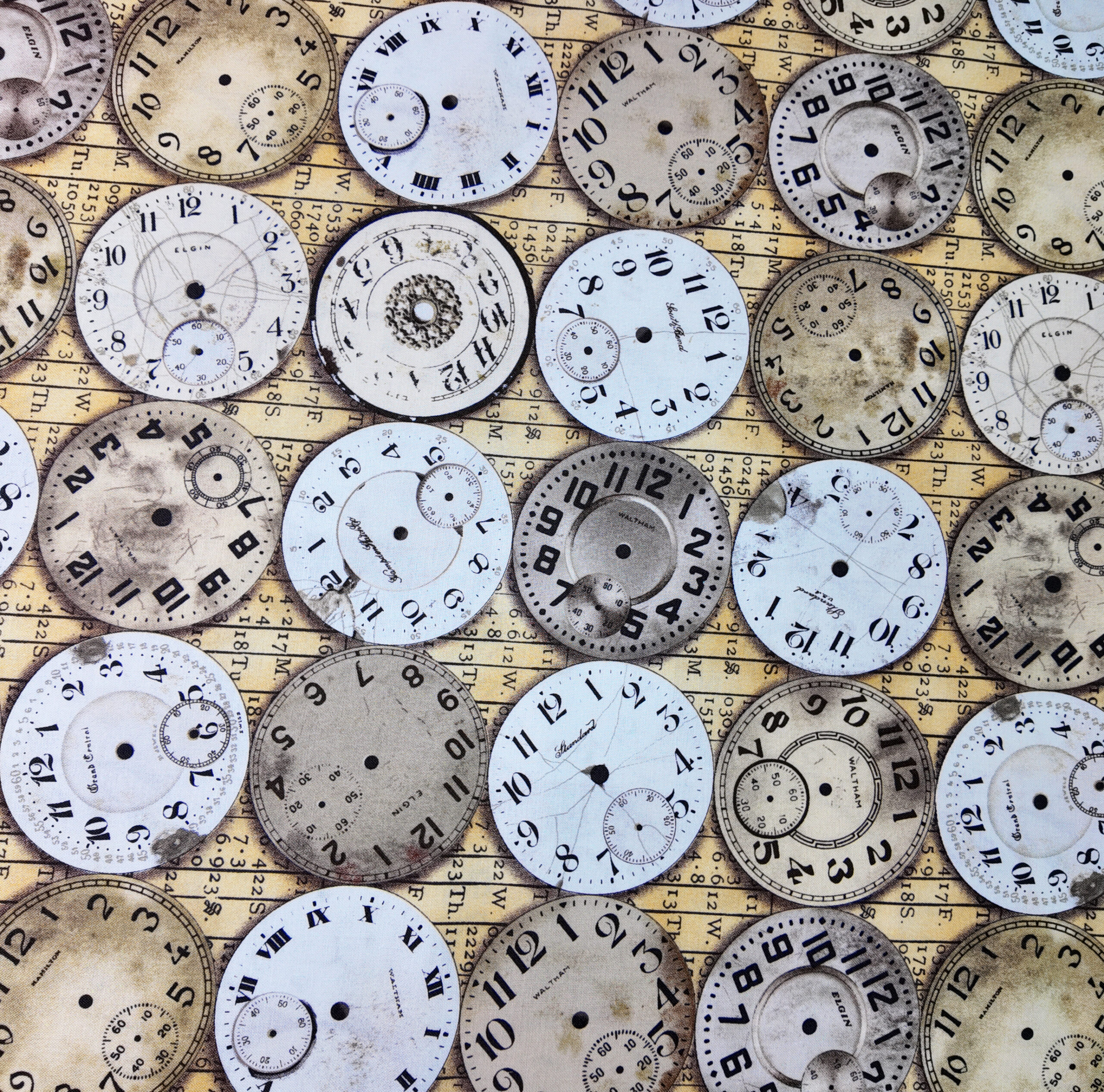 Alignement de cadrans anciens sur fond jauni, chiffres élégants et nuances sépia. Une poésie du temps qui passe, entre traces, usures et lumière douce.