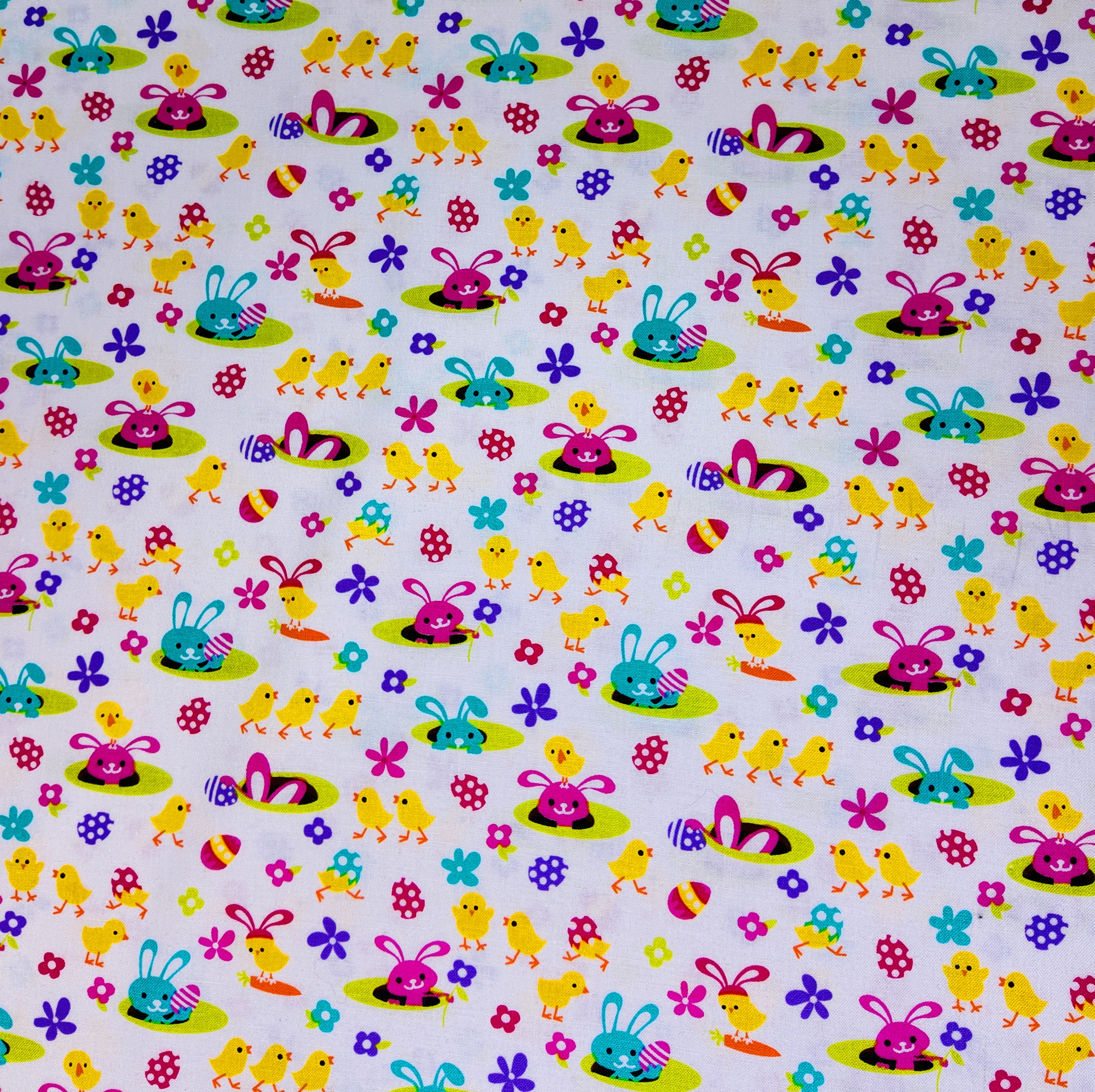 Petits lapins joyeux, poussins et fleurs vives s’animent sur un fond clair dans une ambiance de fête. Ce tissu enchanteur respire la joie enfantine et la légèreté de Pâques.