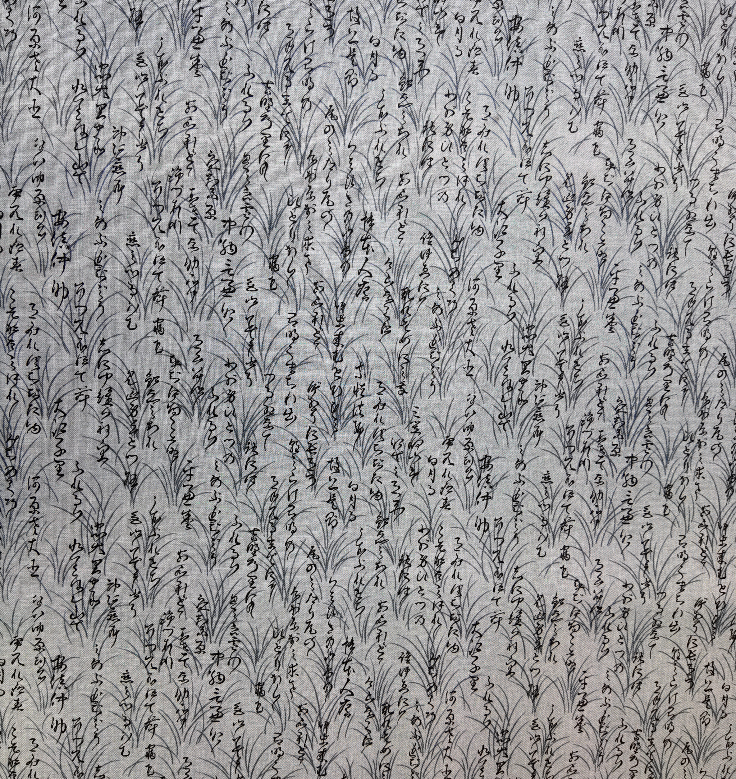 Sur fond gris pâle, une fine écriture japonaise serpente parmi des brins d’herbe délicats. Le motif respire la sérénité d’un poème ancien, suspendu dans la brume d’un matin d’automne.