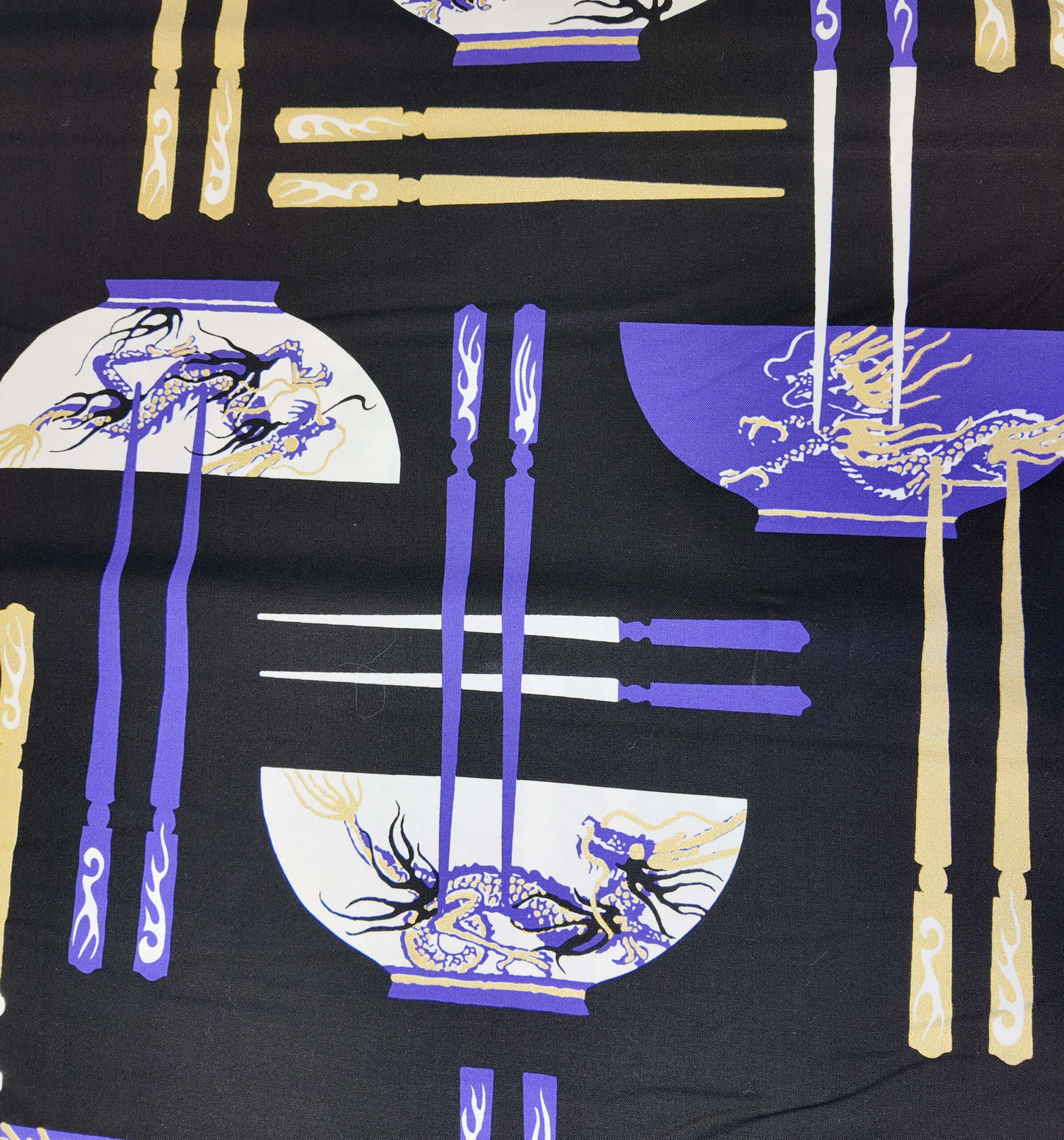 Bols et baguettes s’alignent sur un fond noir profond, ornés de dragons violets et dorés. Un décor élégant et puissant, mêlant tradition orientale et modernité graphique.