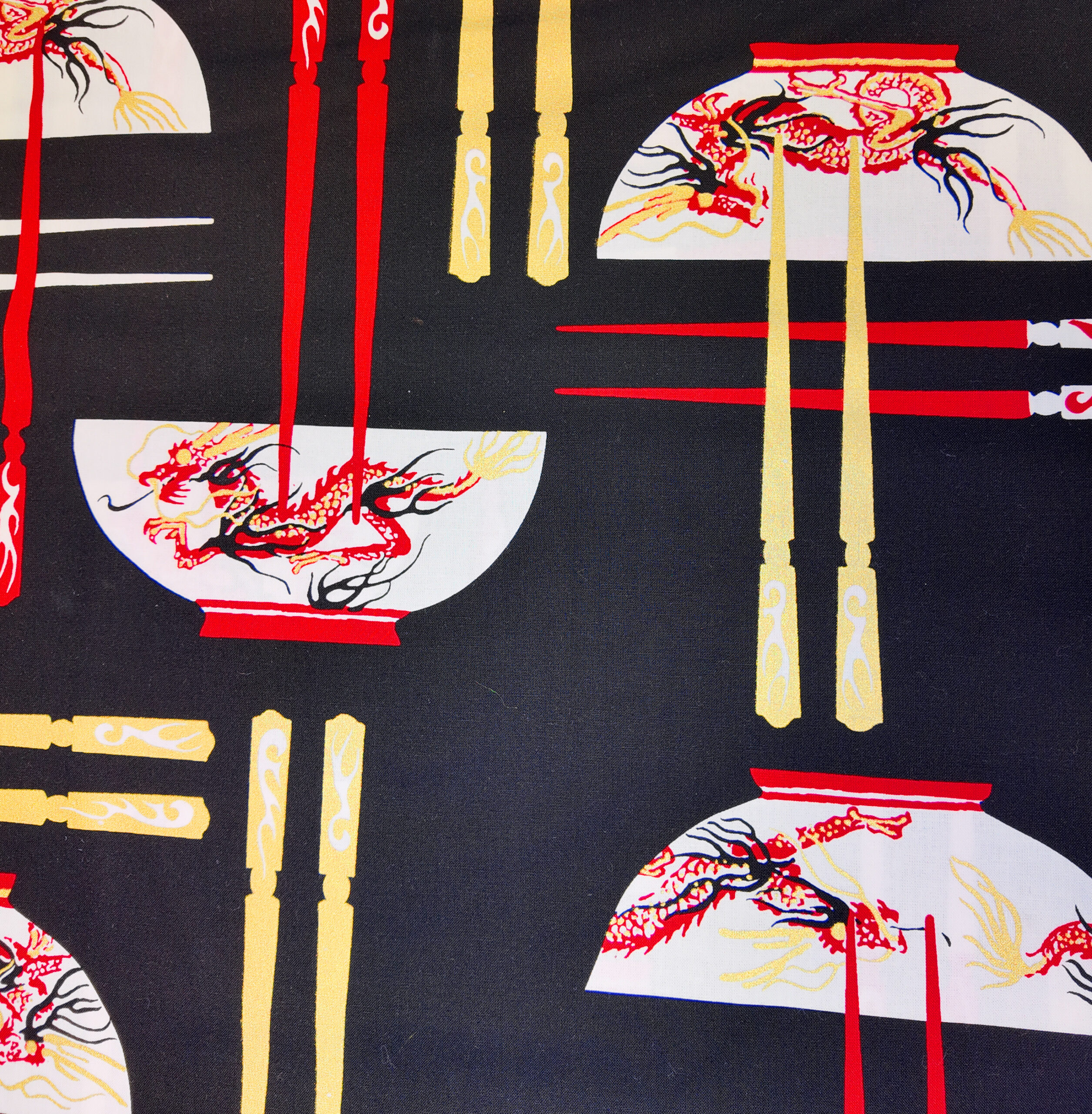 Sur fond noir intense, des bols ornés de dragons flamboyants s’accompagnent de baguettes rouge et or. Le motif évoque la puissance du feu et l’élégance des traditions asiatiques.