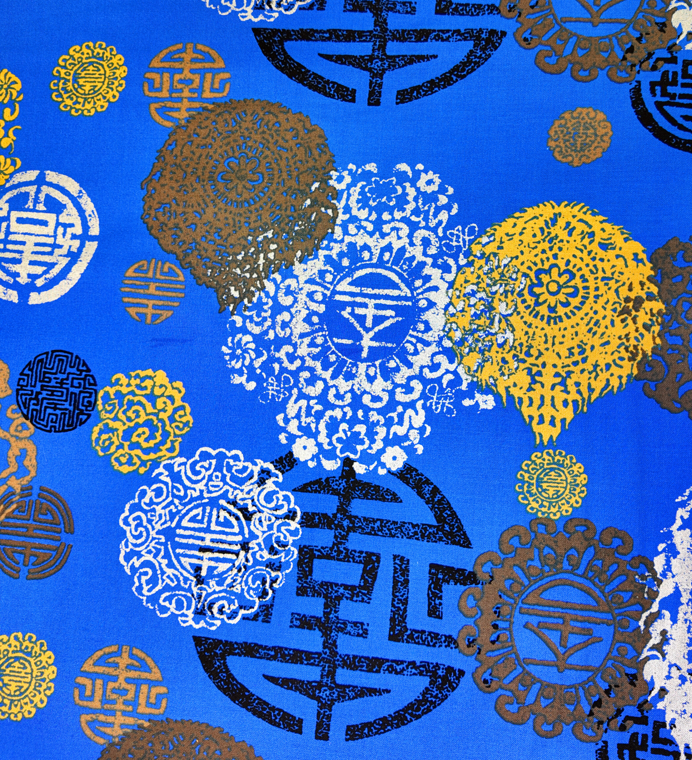Des médaillons dorés, bleus et bruns se superposent sur un fond azur éclatant. Un jeu de symboles et de formes circulaires qui mêle chance et raffinement.