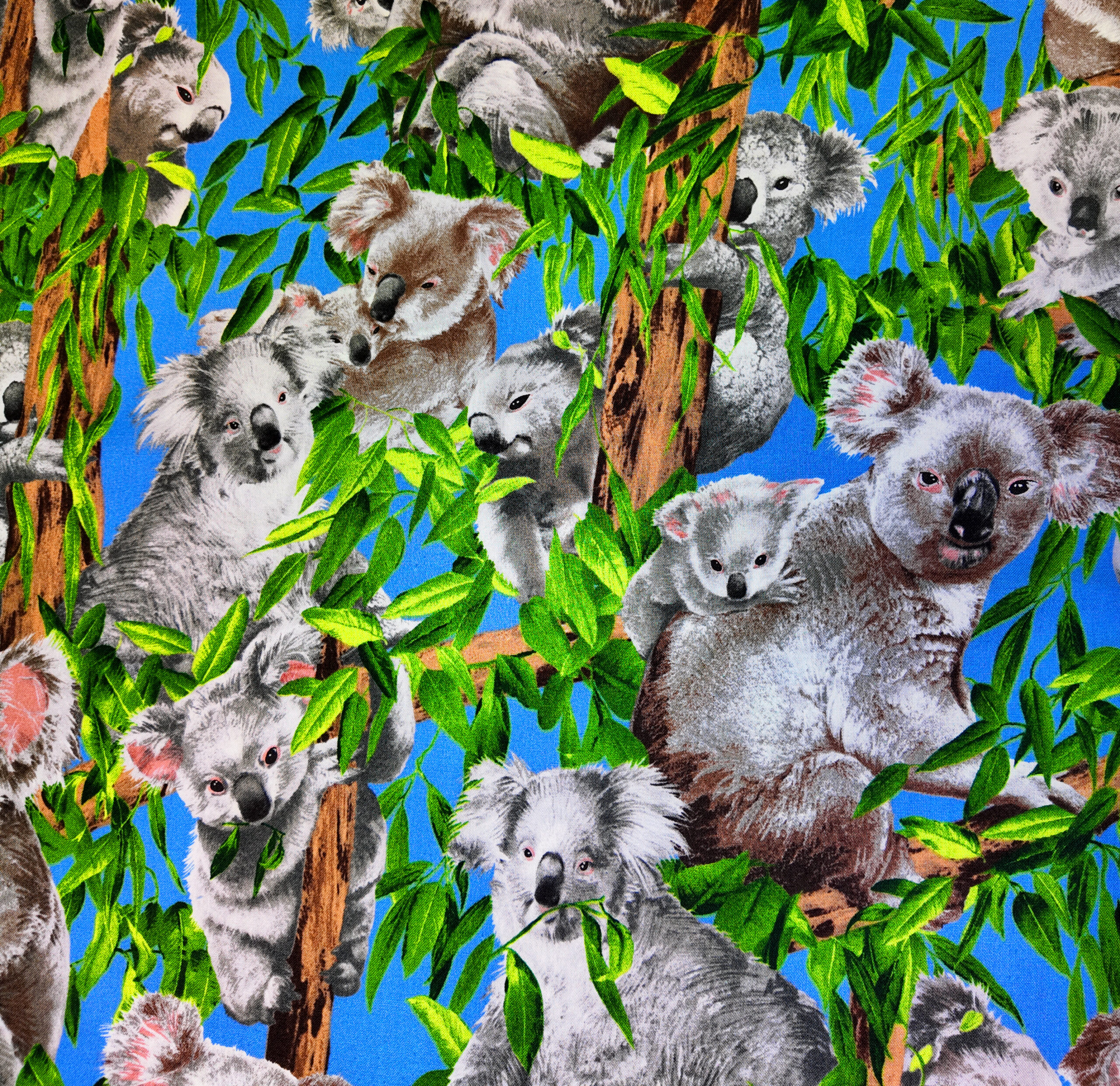 Des koalas argentés se balancent dans un feuillage éclatant sur fond de ciel bleu. Un motif vibrant et joyeux, baigné de lumière océanique.