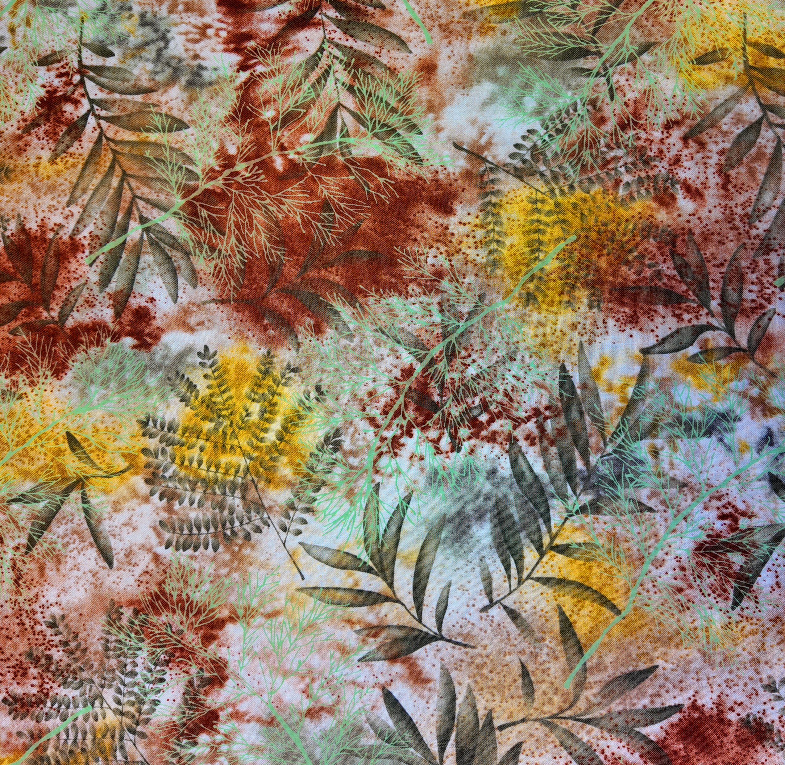 Feuilles et branchages se mêlent dans un souffle de brume, entre rouille, ocre et vert tendre. Le tissu respire la poésie des forêts humides et des matins de rosée.