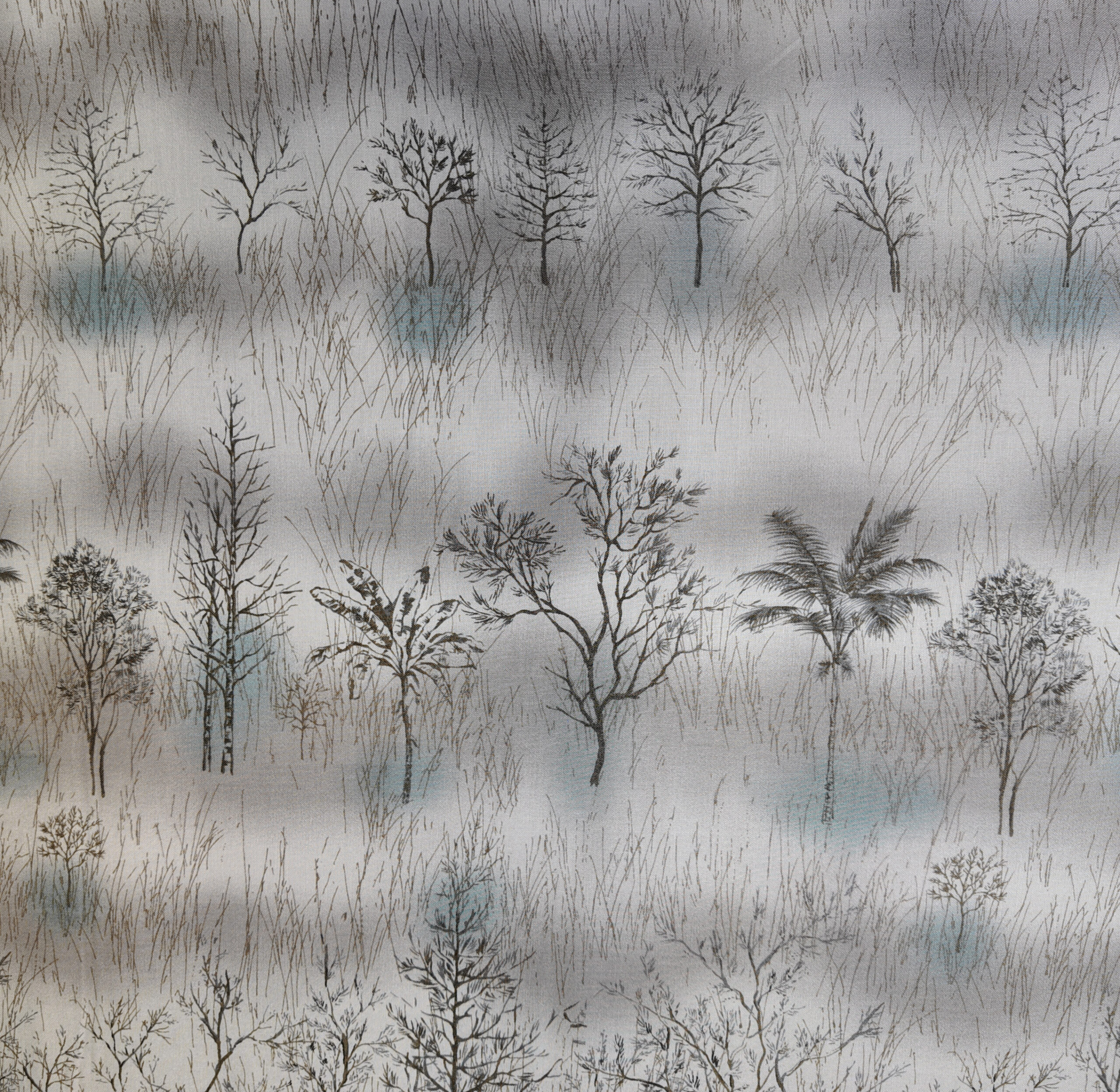 Une brume délicate enveloppe des silhouettes d’arbres aux teintes grises et brunes. Le tissu évoque l’aube d’hiver, douce et mystérieuse.