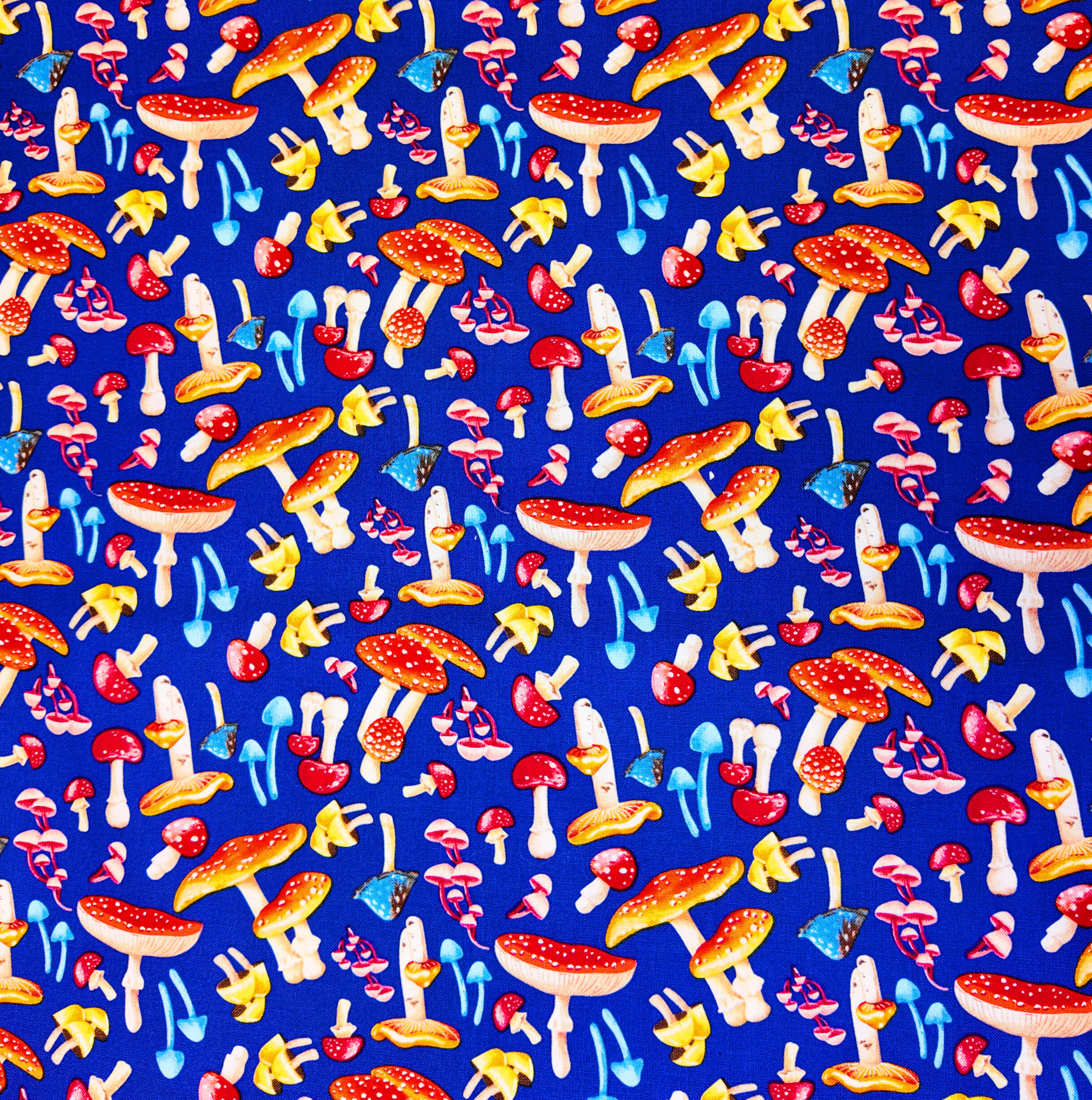 Sur un fond bleu vif, des champignons rouges, jaunes et bleus forment une joyeuse farandole. Un motif ludique et coloré, plein de fantaisie.