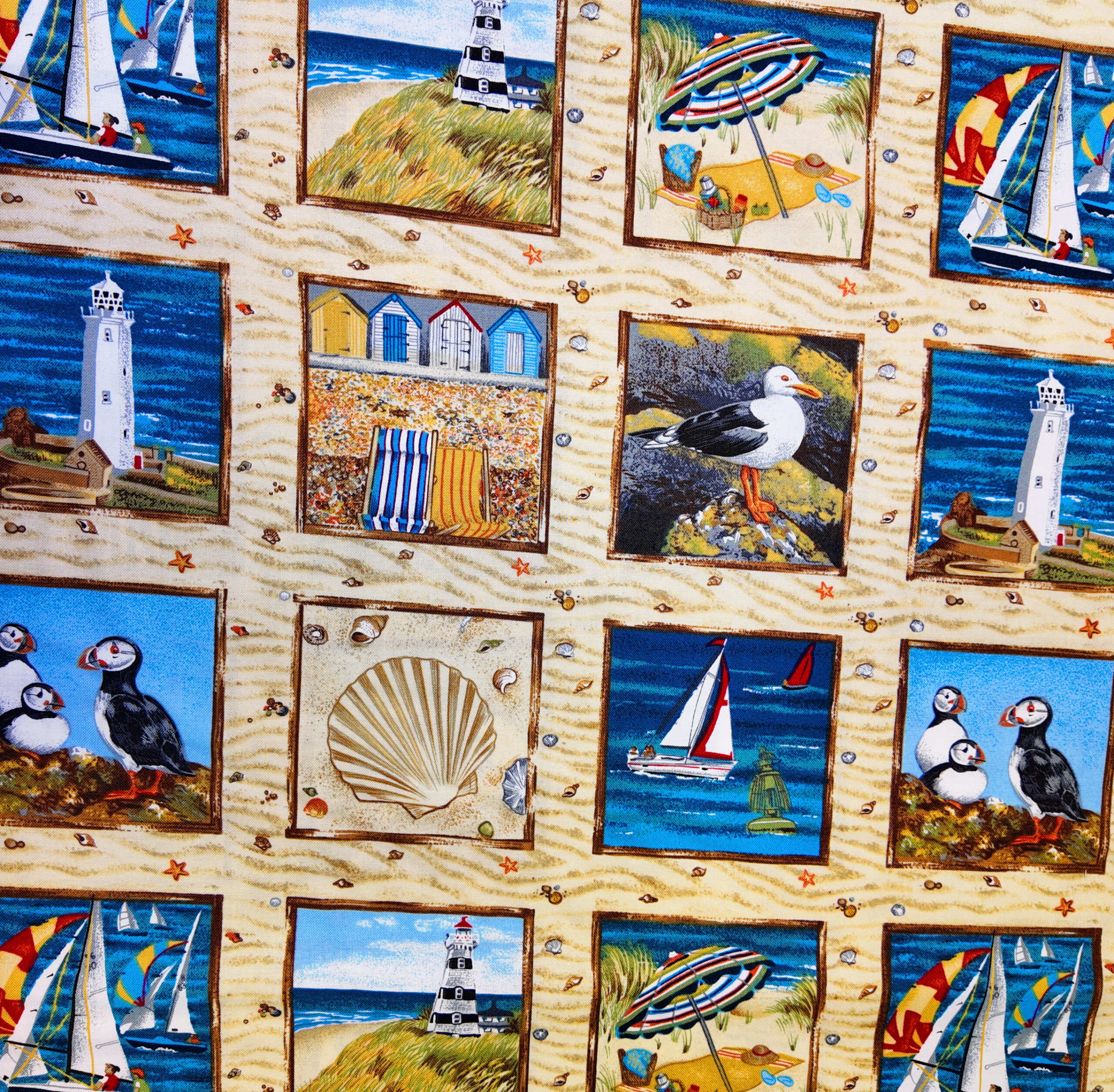 Scènes de bord de mer, voiliers, cabanes colorées et goélands composent une fresque estivale pleine de charme et d’air salin. Un tissu aux accents de vacances.
