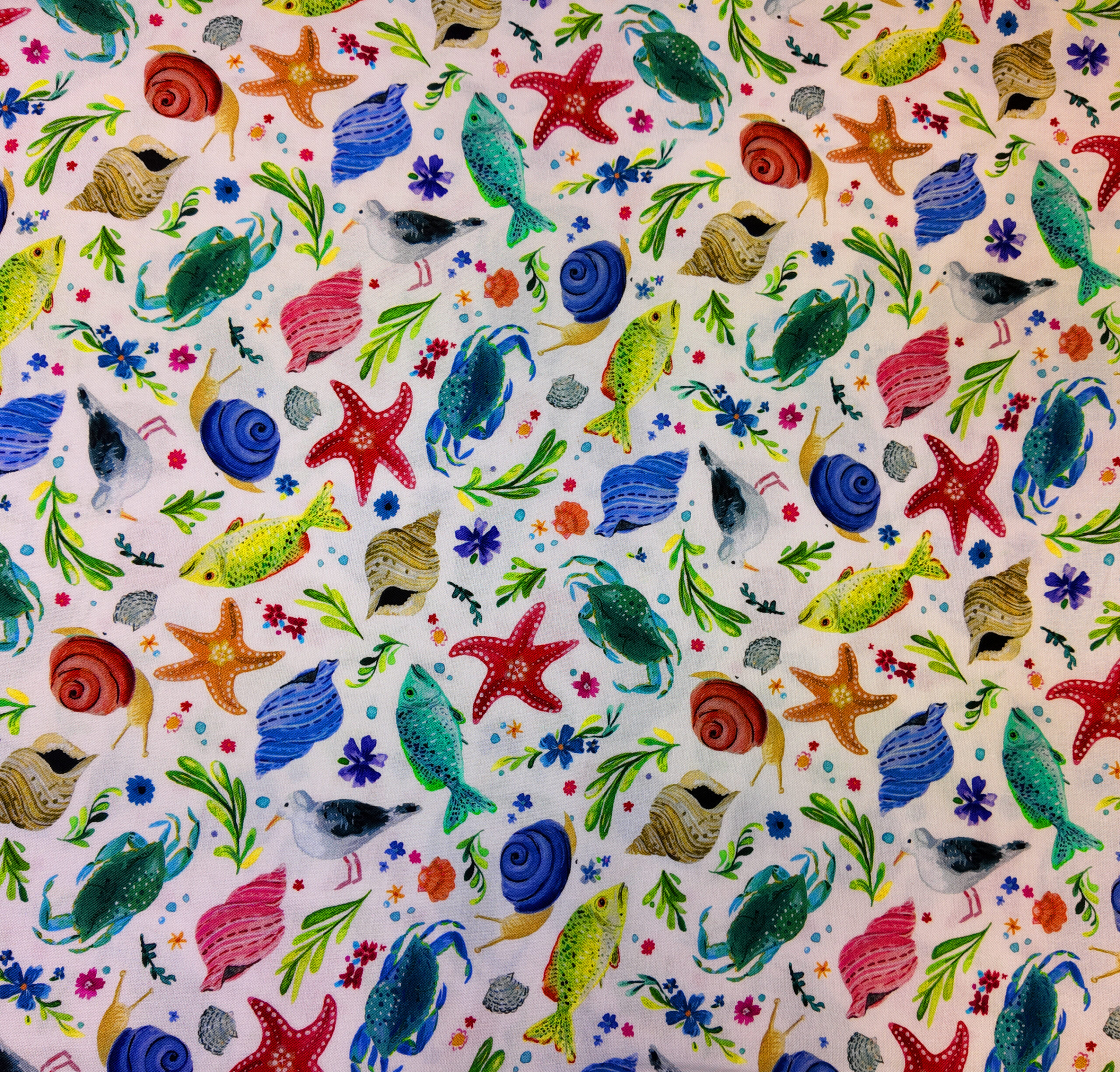 Une farandole joyeuse d’étoiles de mer, de poissons et de coquillages aux teintes aquarellées, sur fond clair. Une invitation à la plage et à la fantaisie estivale.