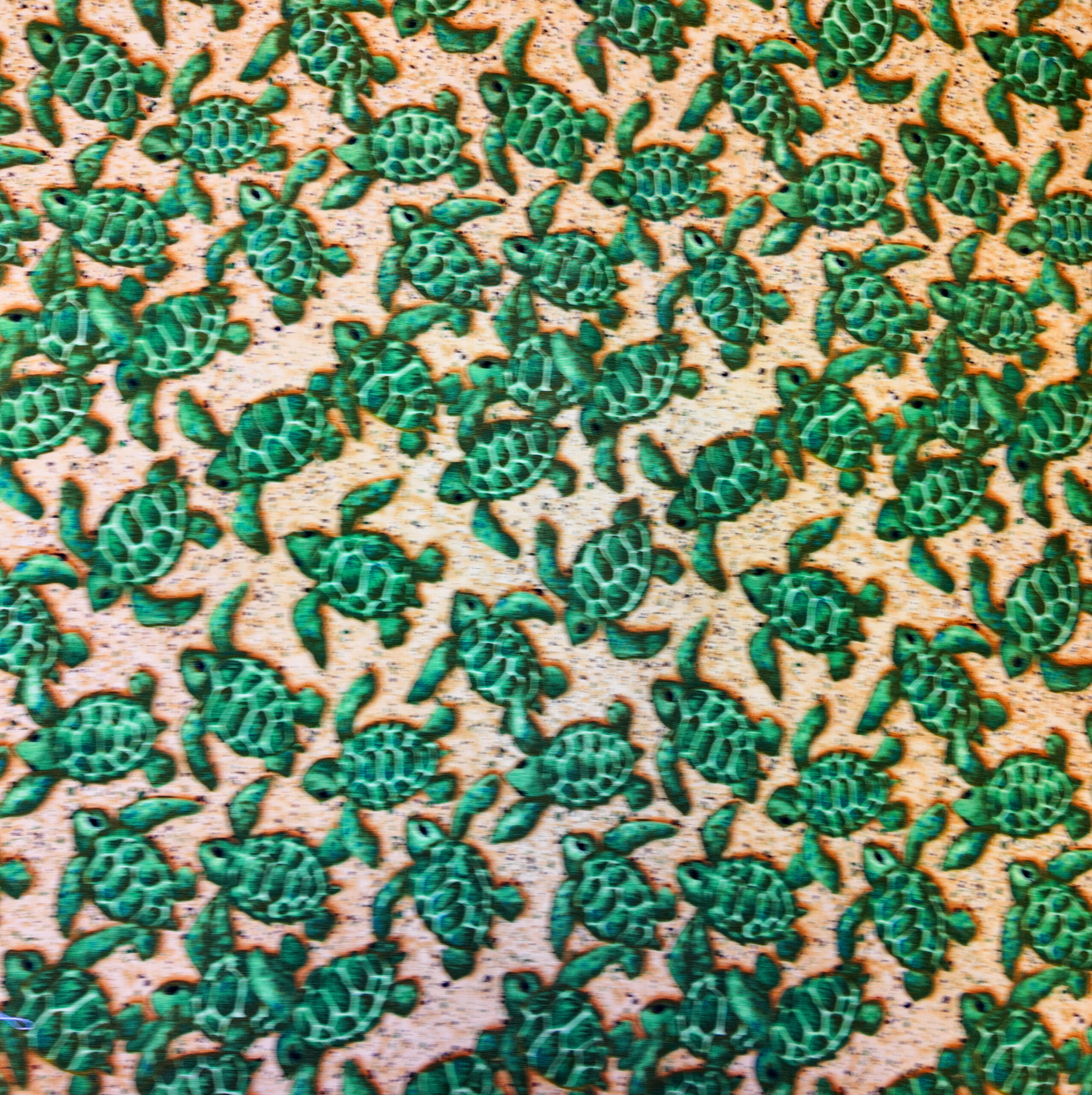 Une multitude de petites tortues vert émeraude avance sur un sable chaud. Ce tissu respire la douceur des tropiques et le rythme paisible des rivages ensoleillés.