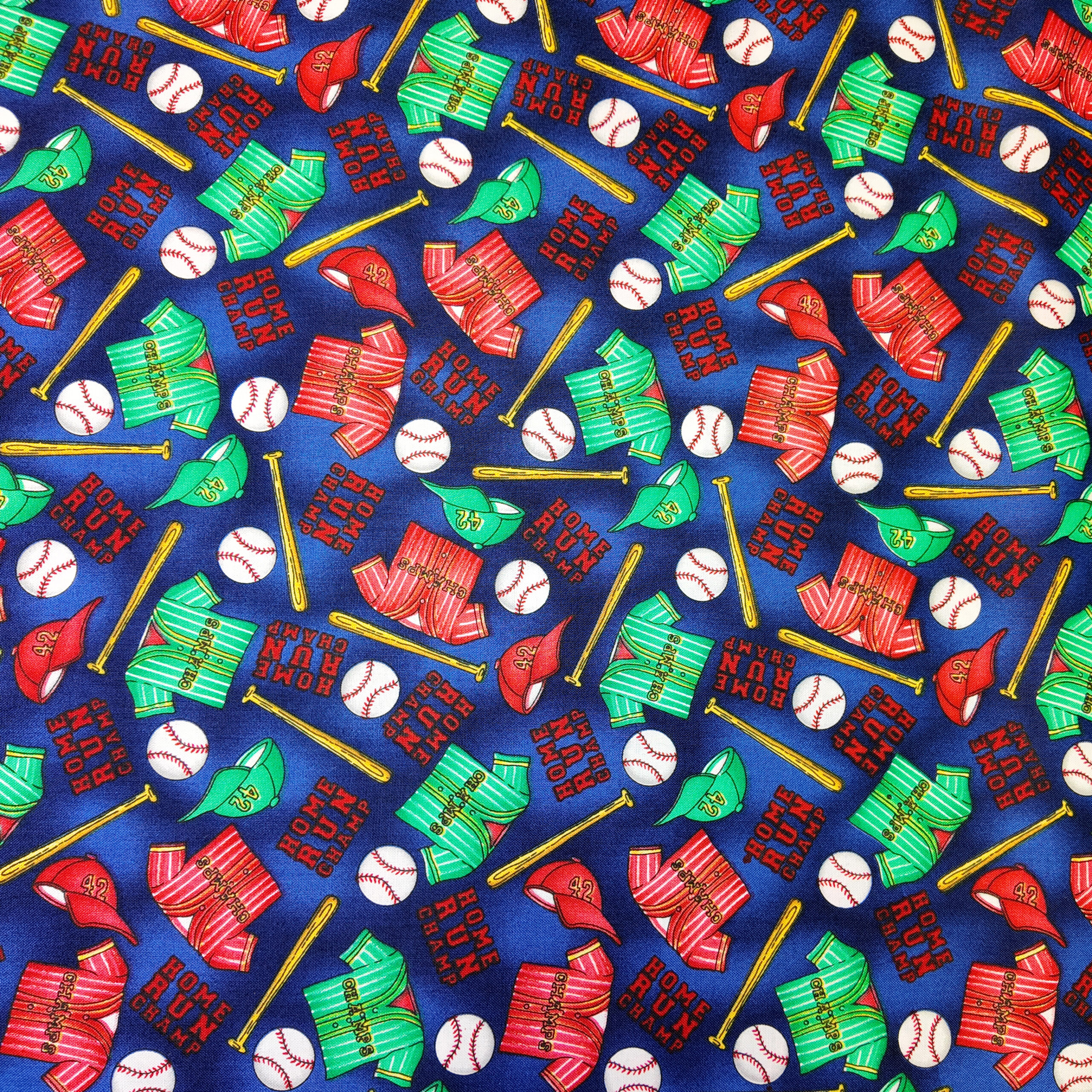 Sur un fond bleu nuit, gants, battes et maillots de baseball s’animent en un joyeux hommage au sport américain. Un tissu plein d’énergie et d’esprit d’équipe.
