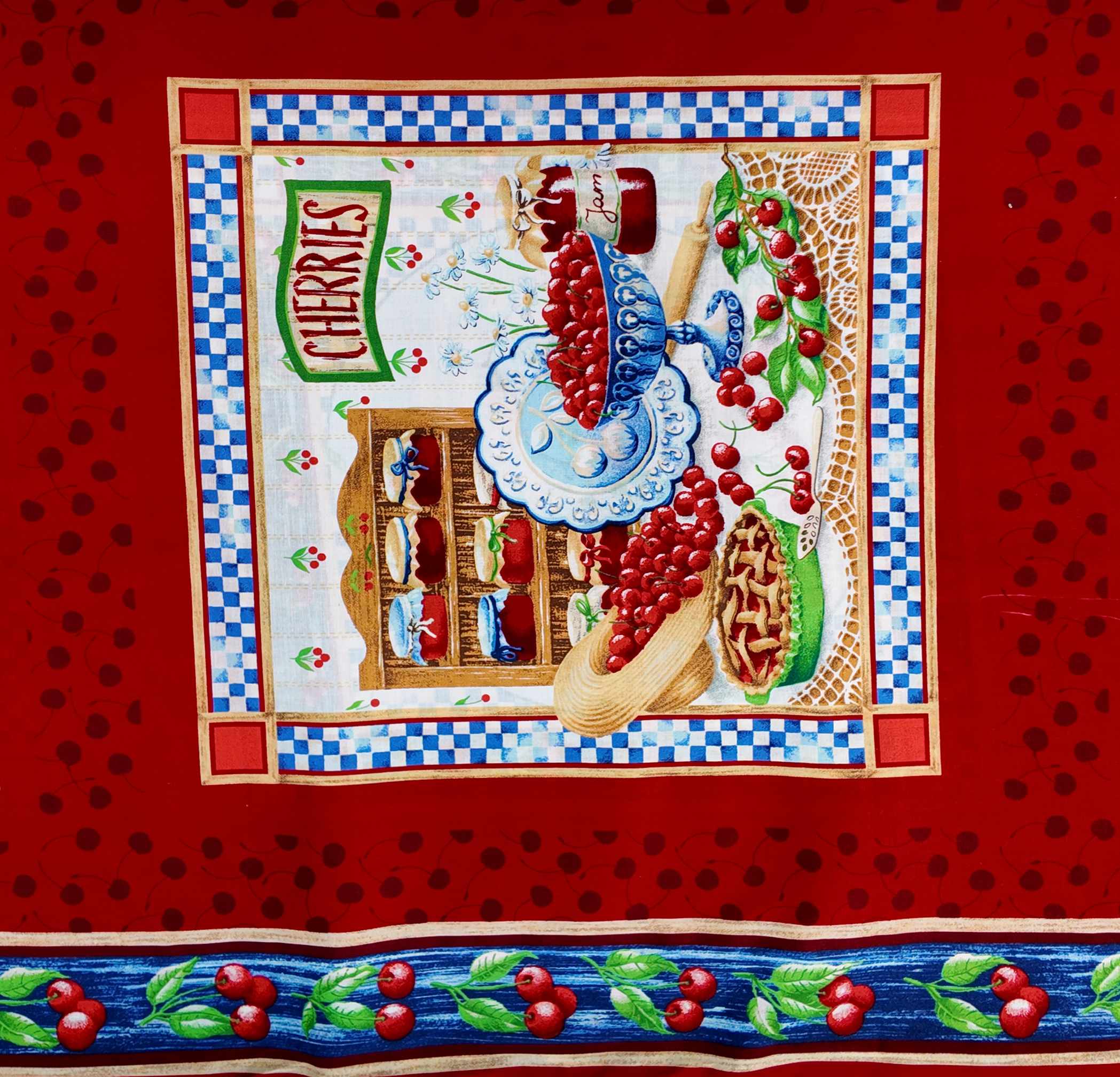 Rouge intense comme une cuisine en fête, ce tissu dévoile une scène gourmande aux cerises brillantes. Le carré central présente confitures, pâtisseries et fruits éclatants entourés de carreaux colorés. Une bordure bleue ornée de cerises complète cette ambiance chaleureuse et joyeuse.