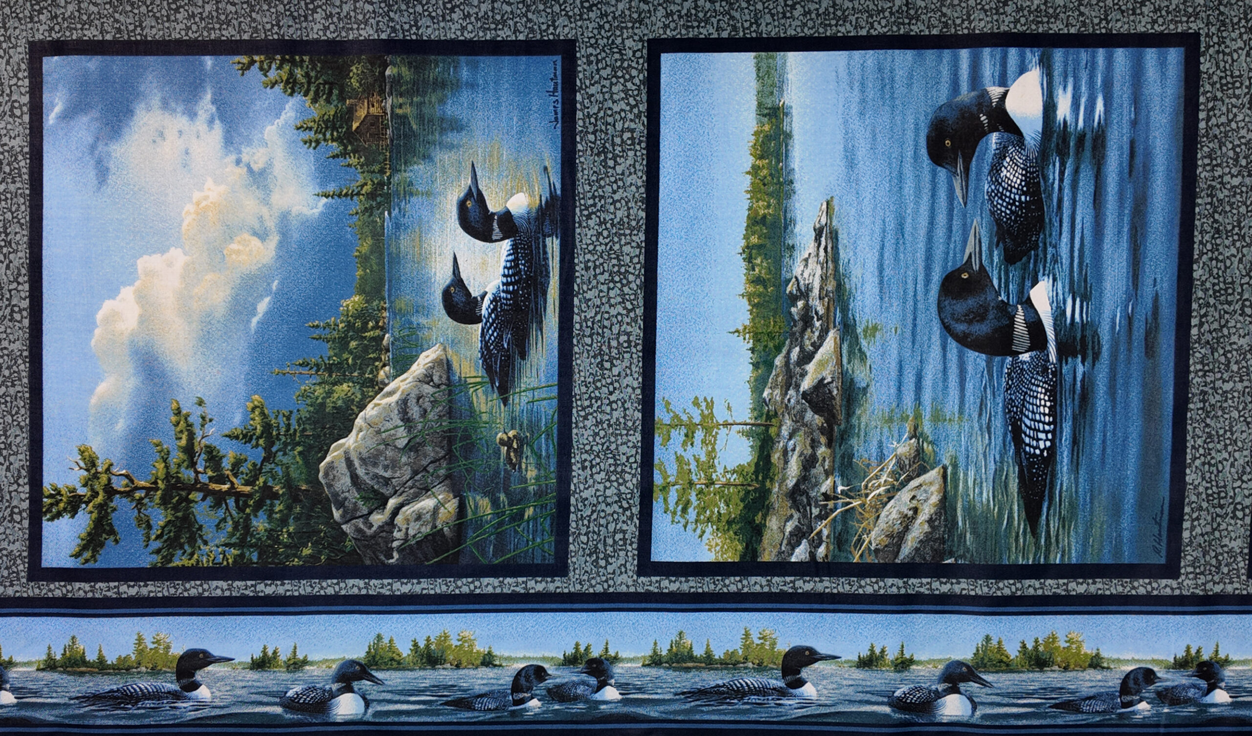 Les plongeons noirs et blancs glissent sur une eau argentée où se reflètent rochers et nuages. Entre pins élancés et horizon calme, les scènes capturent la force et la sérénité des grands lacs du Nord.