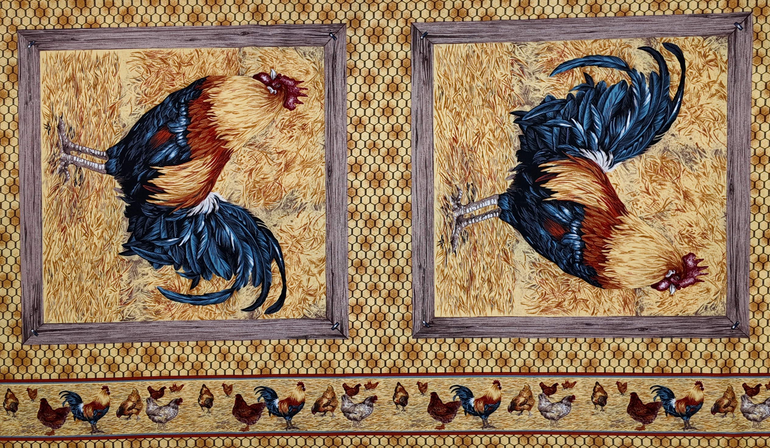 grands coqs majestueux aux plumes brillantes, cernés d’un décor doré rappelant les teintes du foin et de la grange
