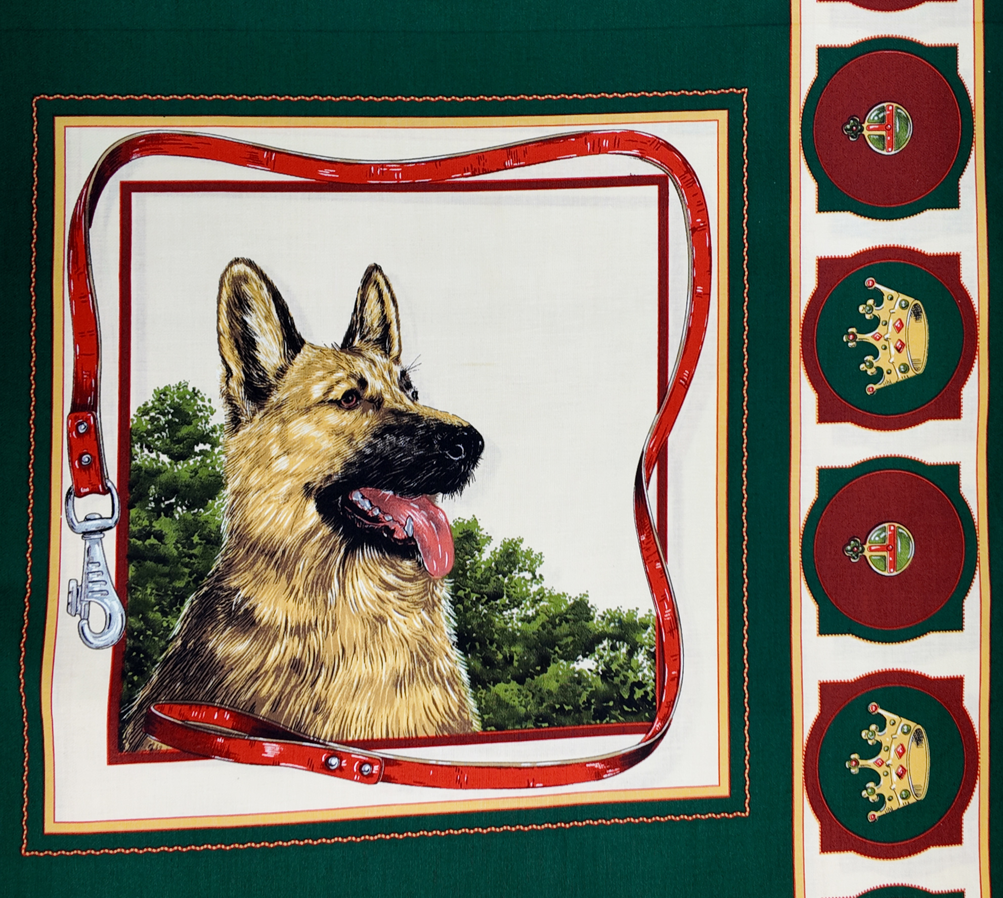 grand berger noble au collier rouge, posé devant un paysage verdoyant