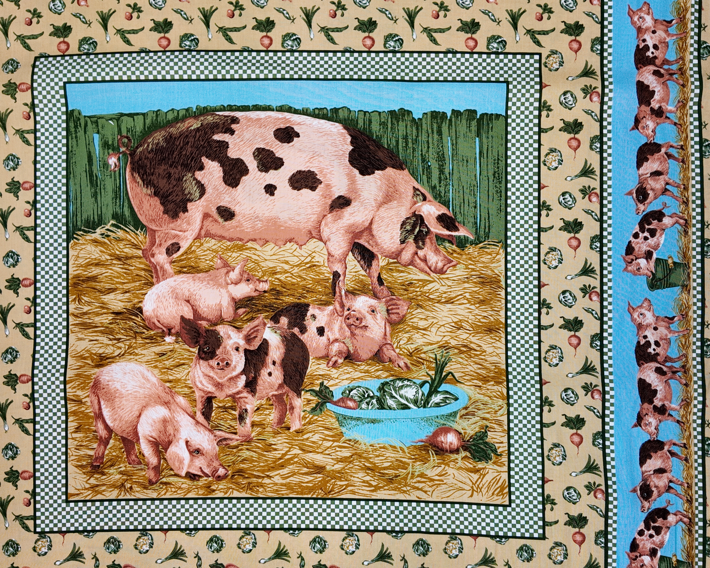 Une scène paisible s’étend autour de la truie et de ses petits, baignés dans une chaleur dorée. Le foin accueille leurs mouvements tendres, tandis que le bleu du bassin apporte une fraîcheur légère. Le vert du jardin en arrière-plan clôt la composition dans une atmosphère simple et généreuse.