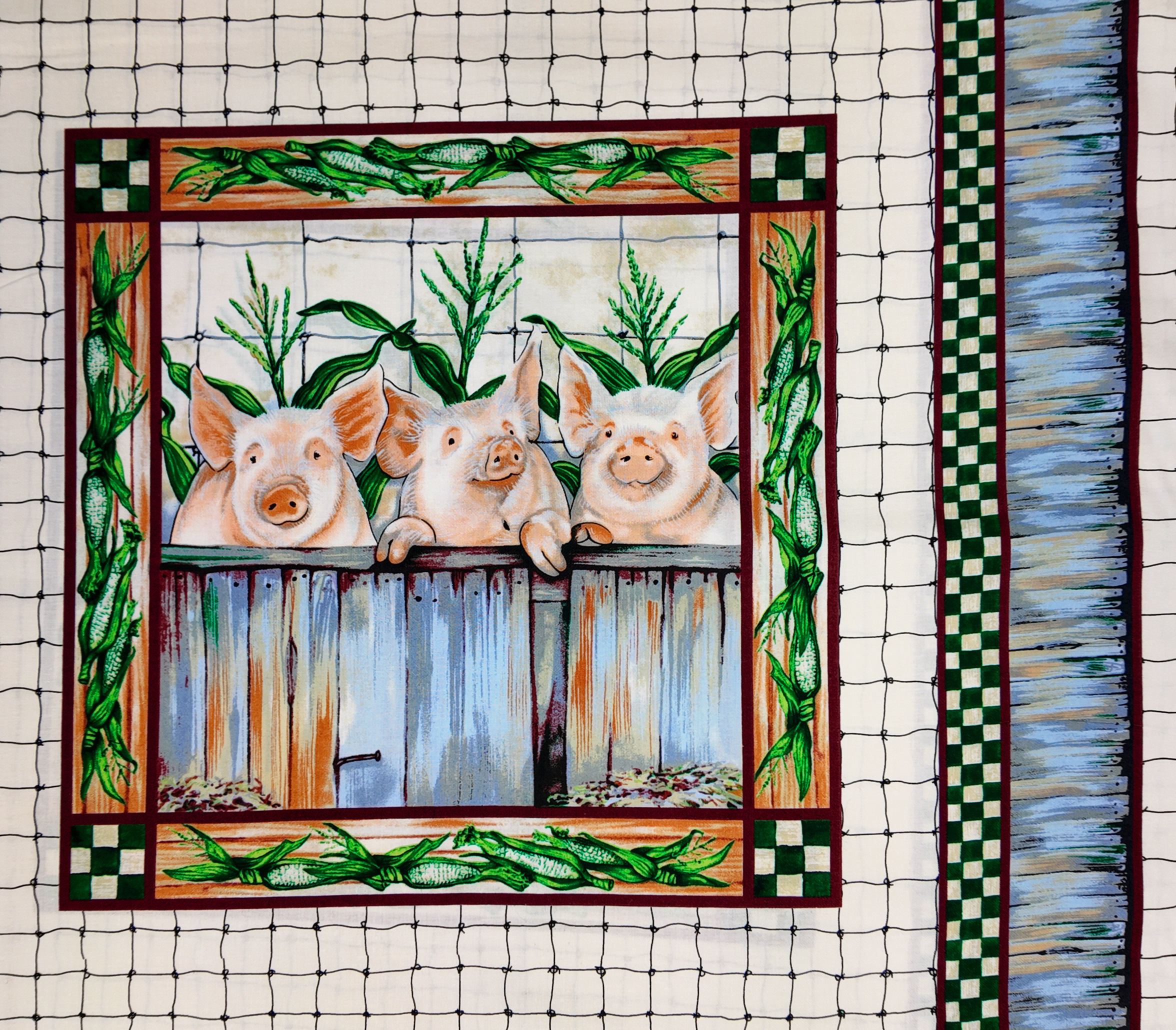 Trois cochons apparaissent derrière une barrière patinée, leurs museaux tournés vers la lumière douce. Autour d’eux, des feuilles élancées ajoutent des touches de vert vivifiant sur un fond clair et lumineux. L’ensemble dégage une fraîcheur champêtre et joyeuse.