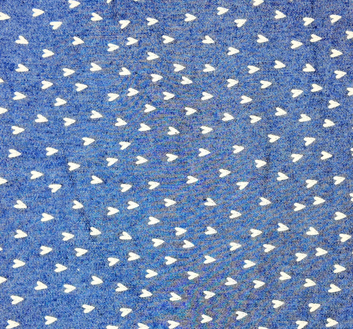 Denim bleu clair parsemé de petits cœurs blancs. Son motif régulier et lumineux apporte une touche tendre et légère aux créations décontractées.