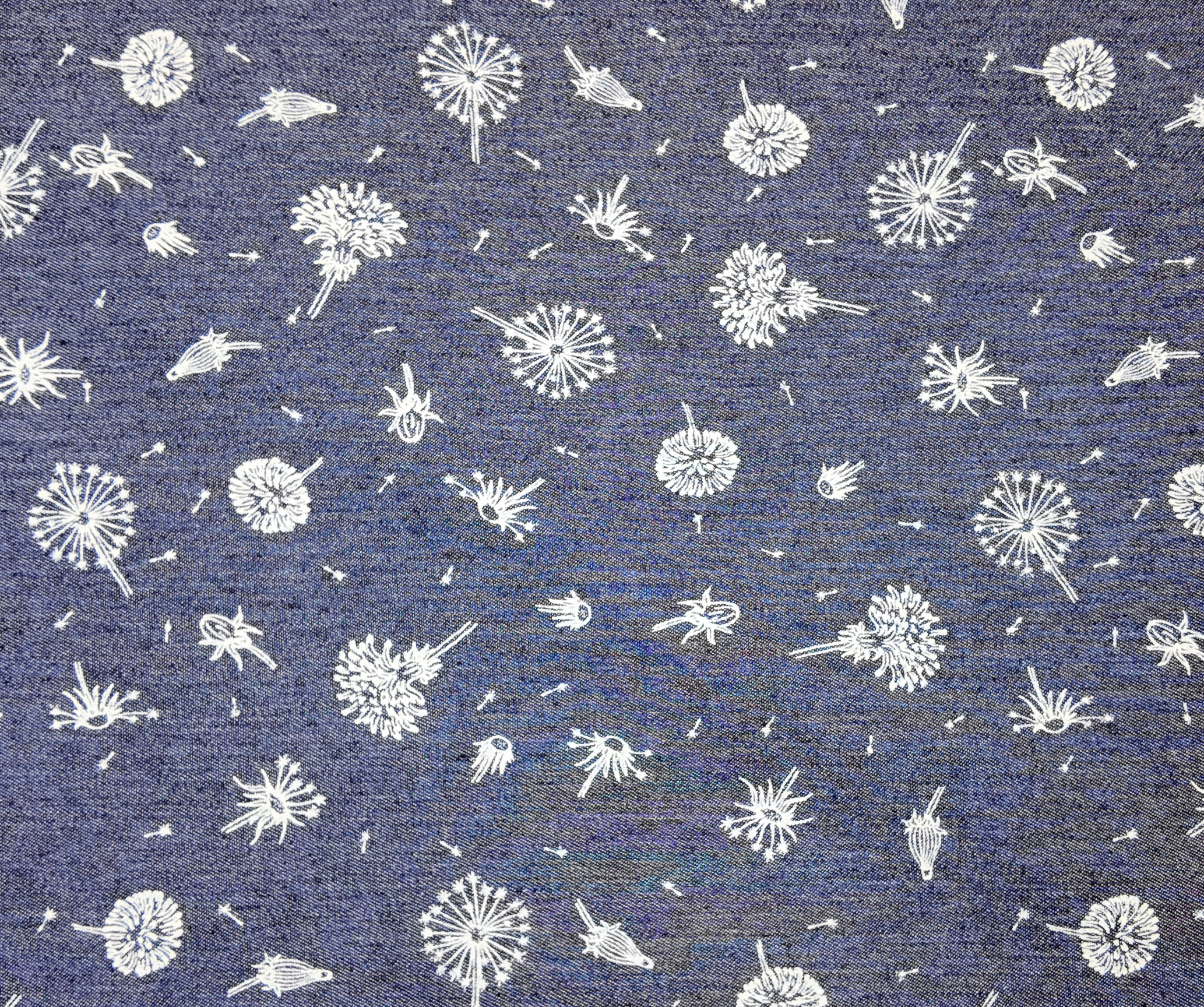 Denim bleu orné de pissenlits blancs soufflés par le vent. Un motif poétique et aérien qui inspire la liberté et la douceur du mouvement.