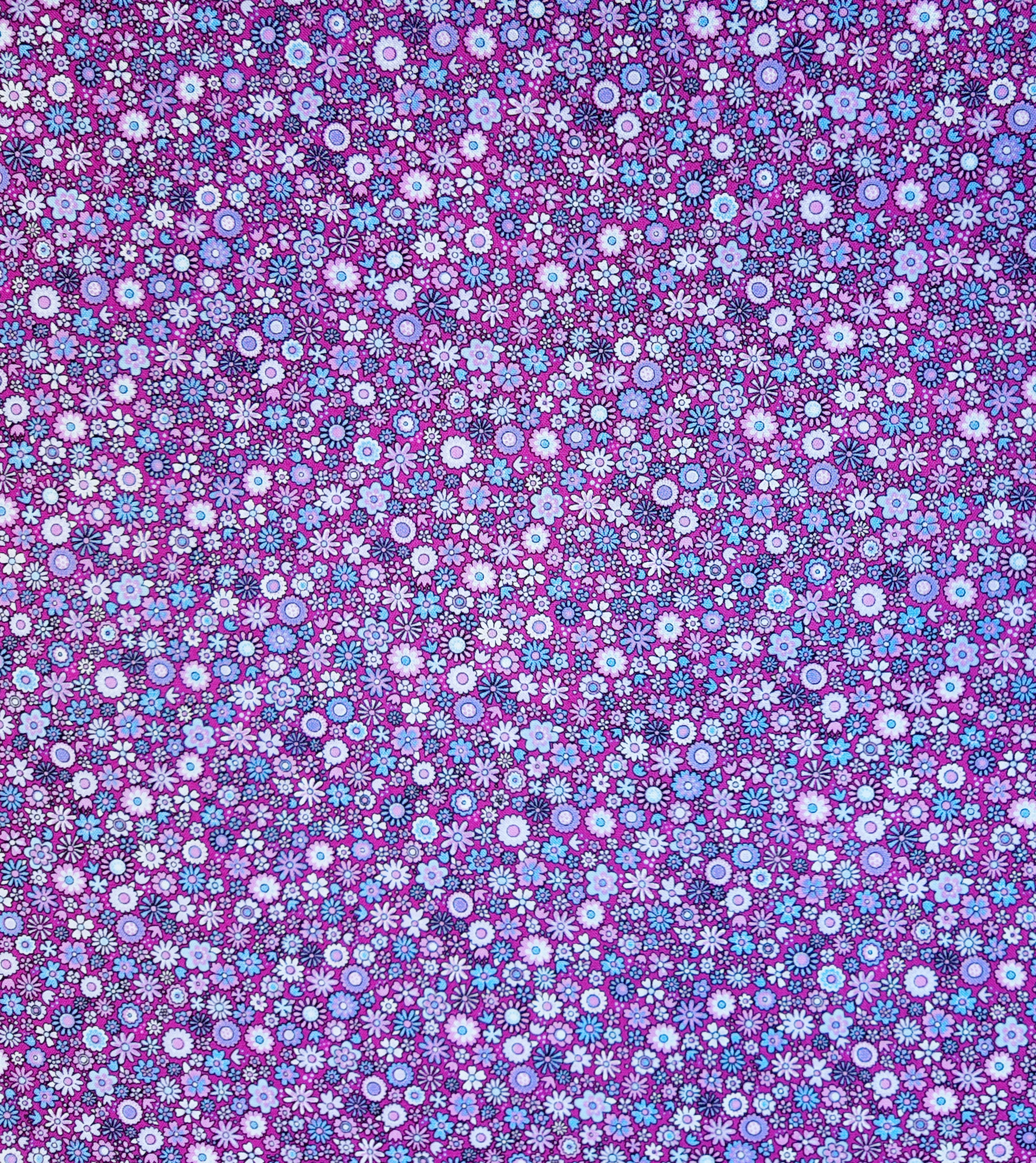 camaïeu de fleurs bleues et violettes sur fond prune, un univers nocturne et lumineux à la fois, empreint de mystère.