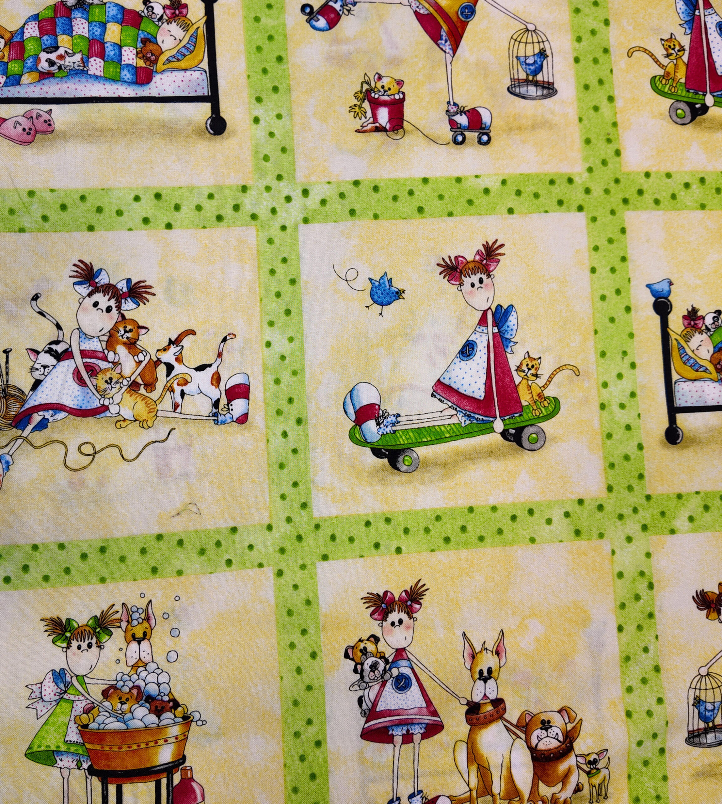 petits personnages et animaux sur fond jaune et vert, un décor naïf et joyeux empreint de tendresse.