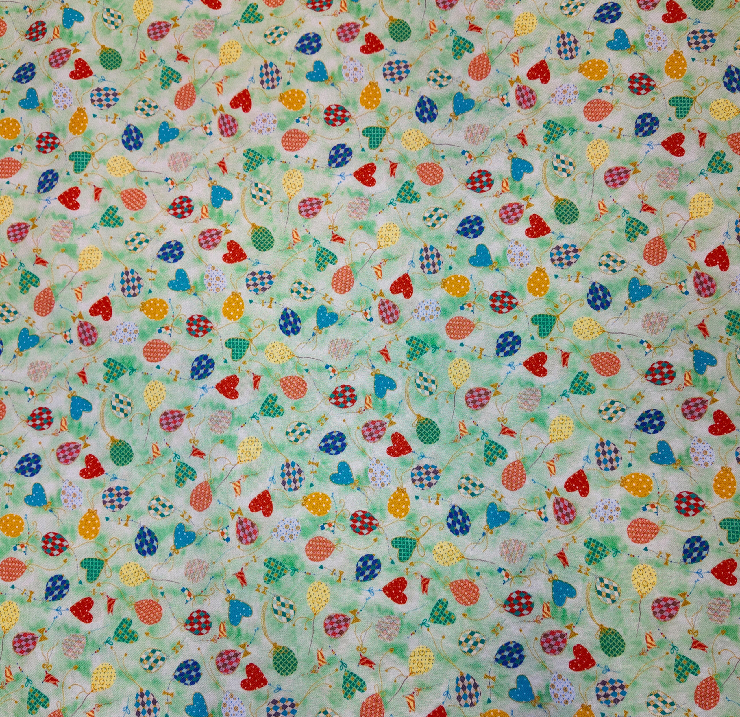 cœurs colorés et ballons à motifs vichy, un tissu doux et joyeux rappelant les fêtes printanières.