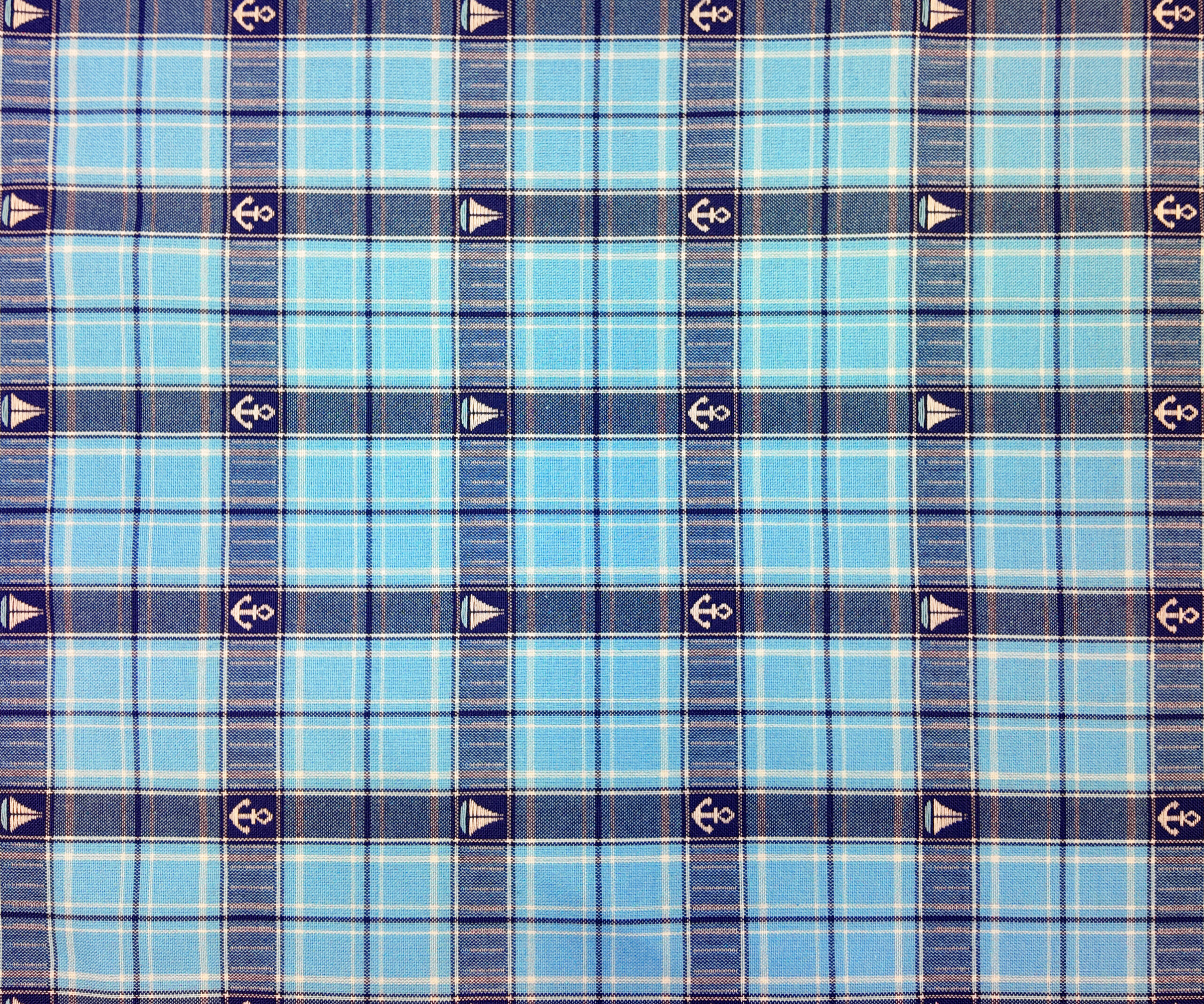 Tissu à carreaux bleu clair et marine, animé de petits motifs d’ancres et de voiliers. Un souffle marin et ensoleillé qui rappelle les escapades côtières.