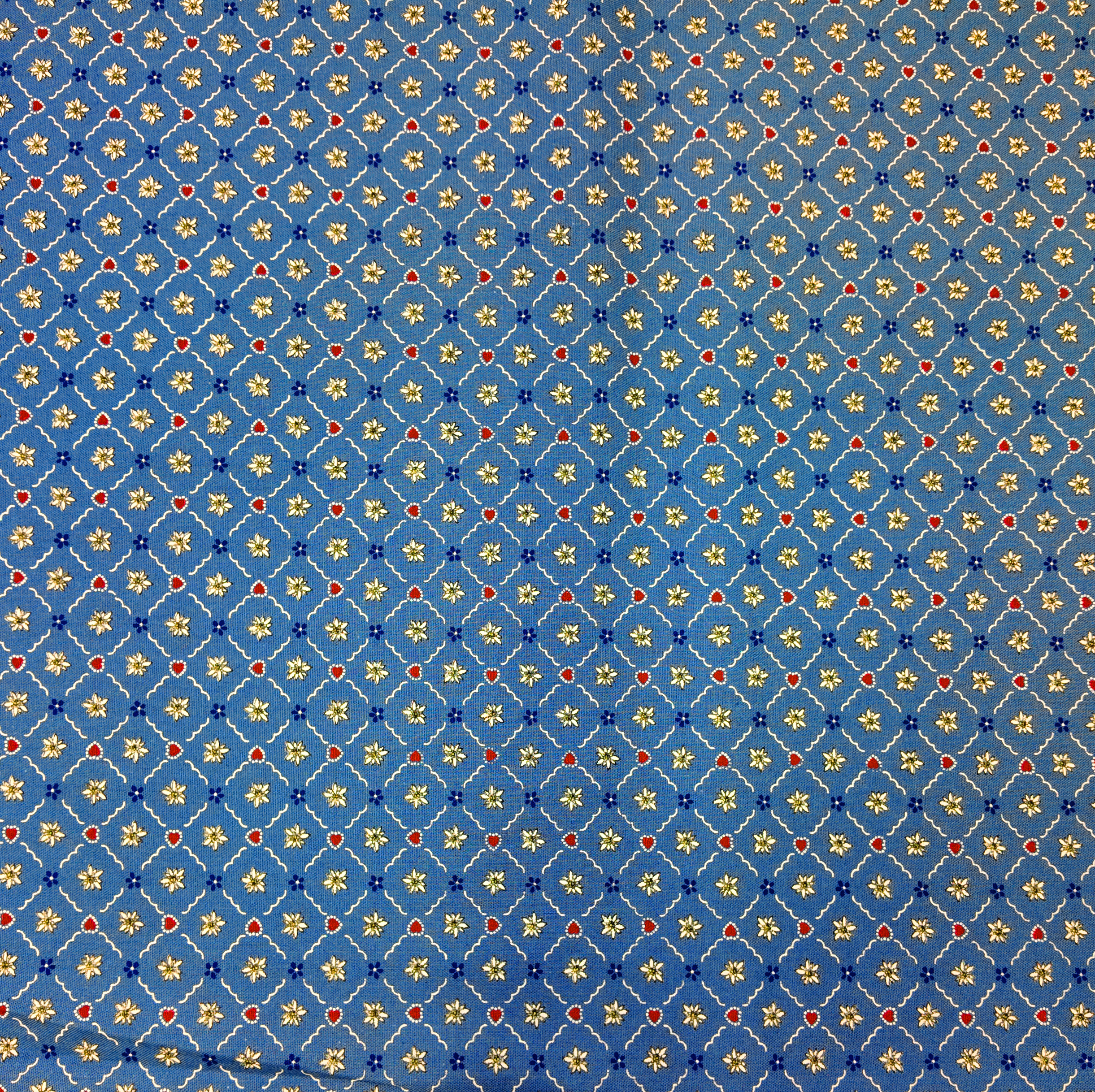 Fond bleu profond décoré de petites fleurs crème et de cœurs rouges reliés en motif de losanges. Une inspiration alpine élégante et vive.