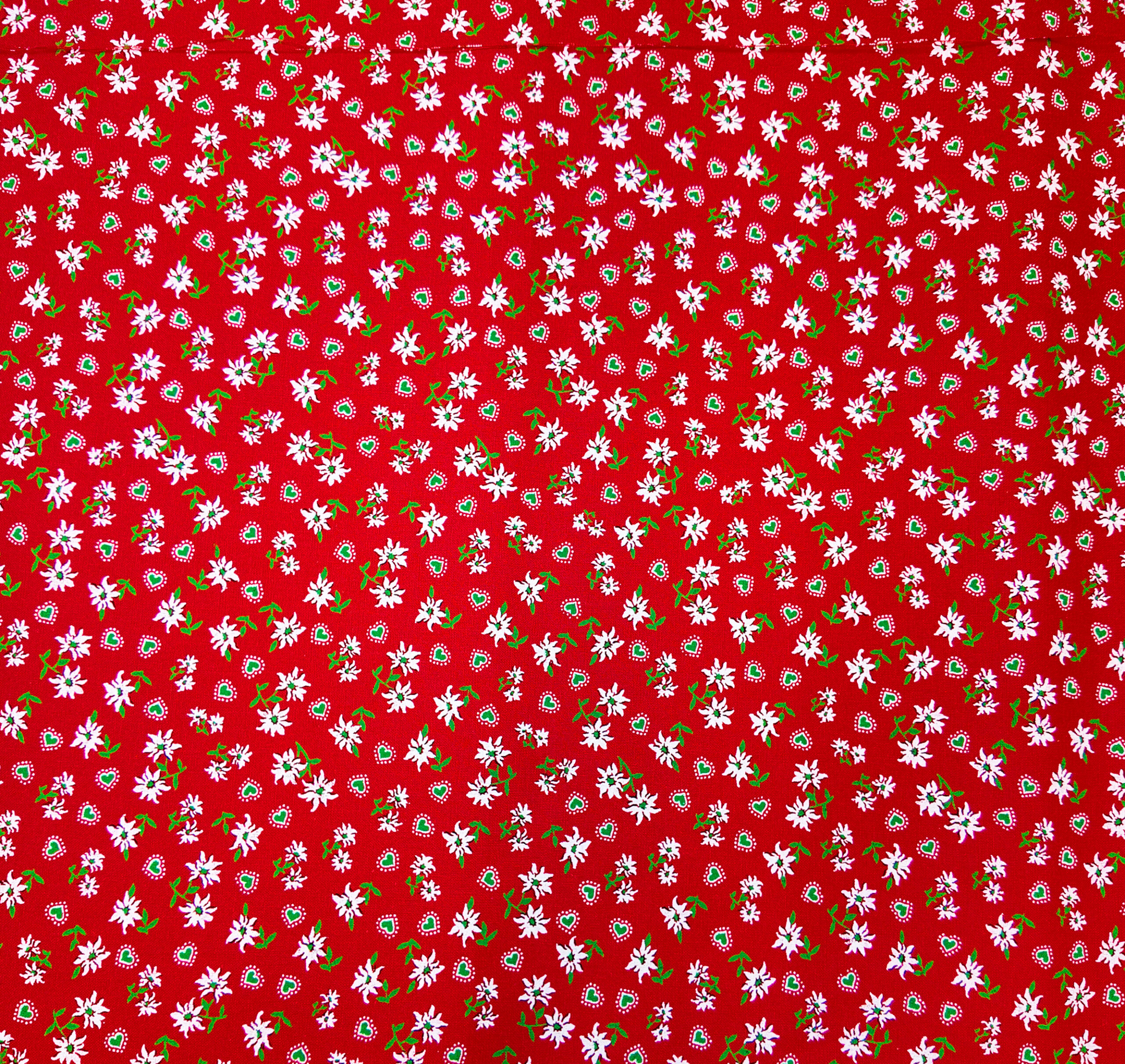 Tissu rouge vif à motif d’edelweiss et de cœurs, éclatant et chaleureux comme un chalet fleuri en été.