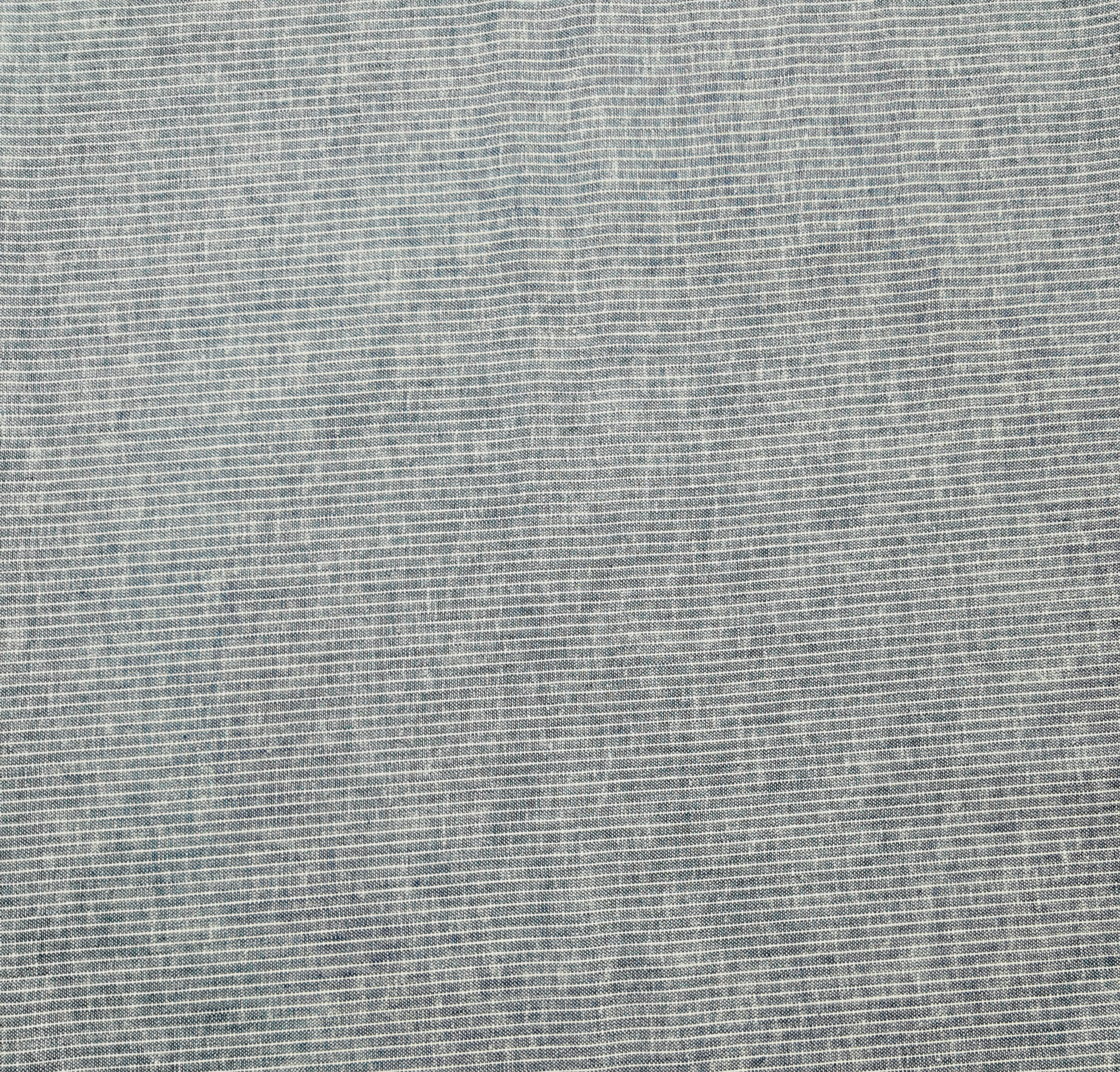 Un bleu grisé, presque pastel, strié de lignes fines qui rappellent une lumière posée sur l’eau. L’ensemble dégage un sentiment de fraîcheur tranquille, une élégance naturelle et discrète.Tissus en lin
