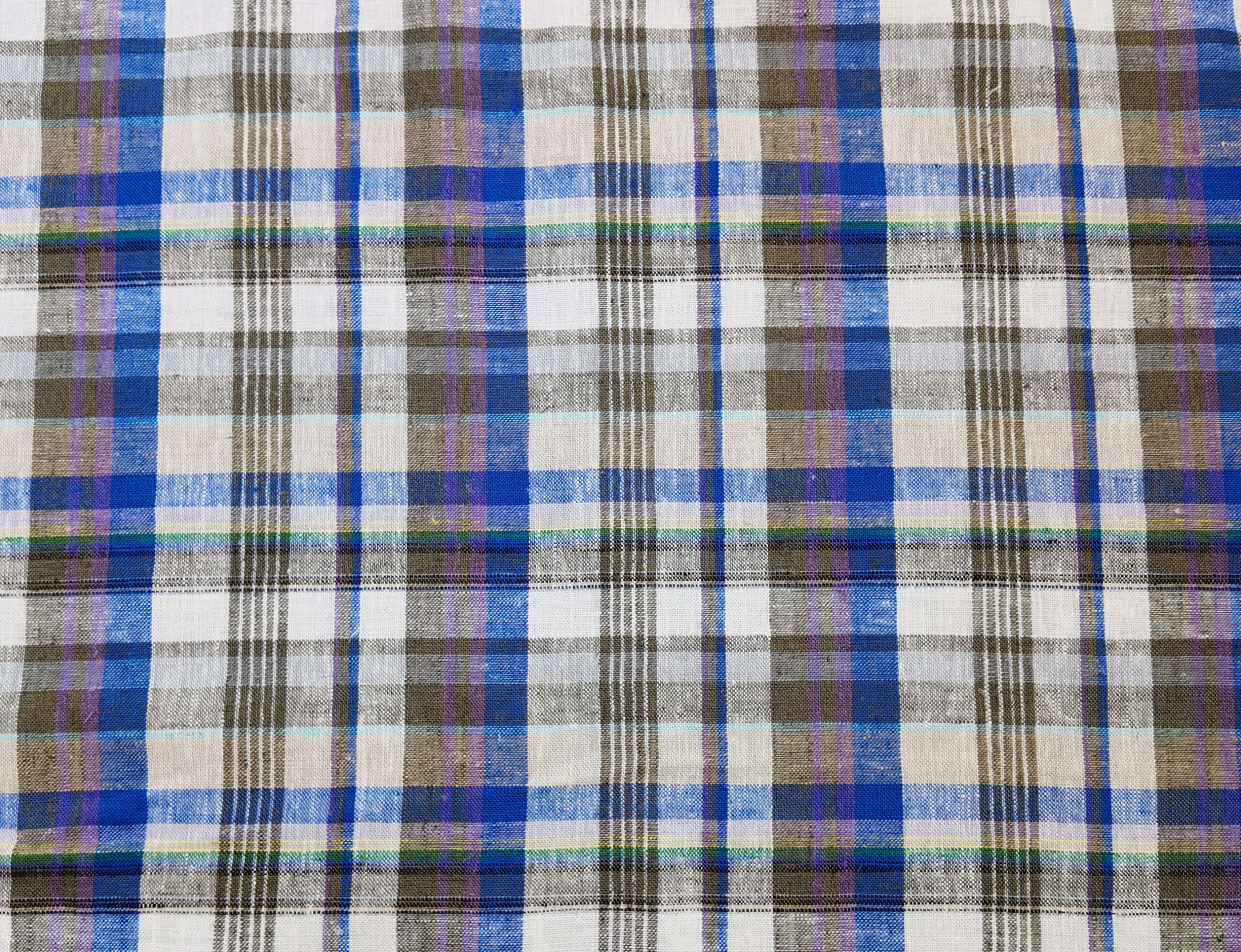 un quadrillage vibrant où se croisent des bleus profonds, des bruns terreux et des touches de violet qui se mêlent à une lumière douceTissus en lin