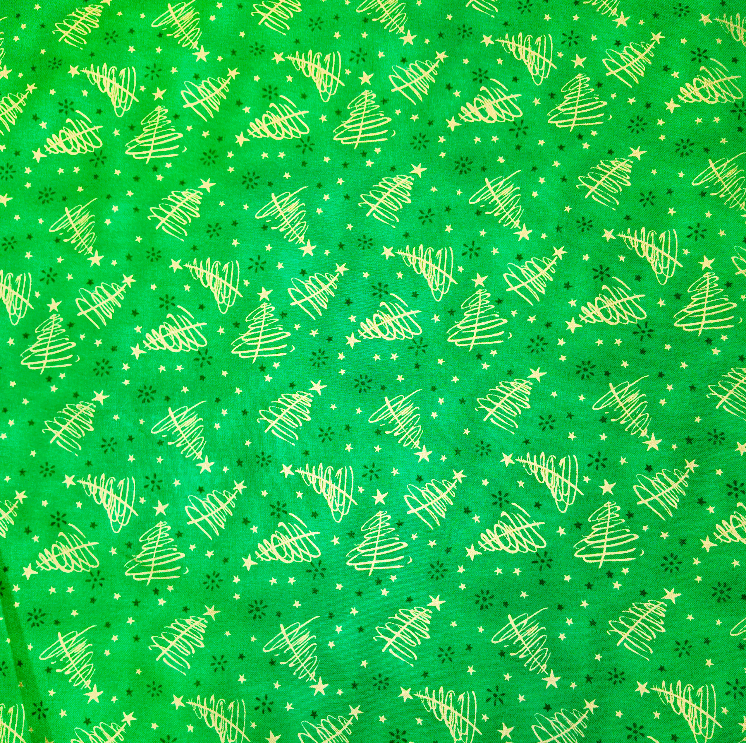 Petits sapins dorés esquissés d’un trait sur fond vert vif. L’ensemble évoque une forêt enchantée sous les étoiles de décembre.