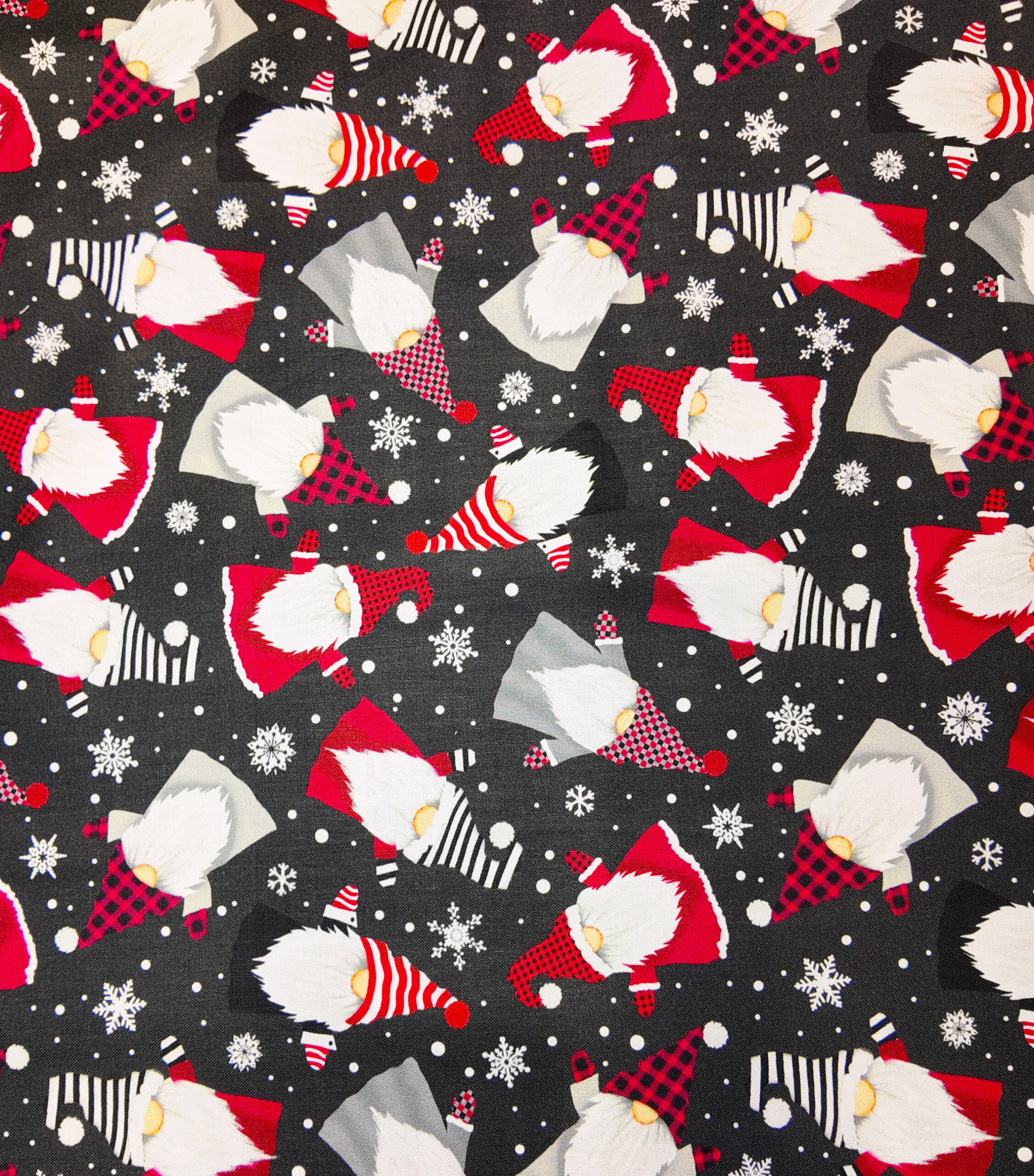 De joyeux lutins barbus dansent sur un fond gris charbon, coiffés de bonnets rouges et rayés. Leur esprit malicieux et hivernal apporte un vent de fantaisie et de tendresse nordique.
