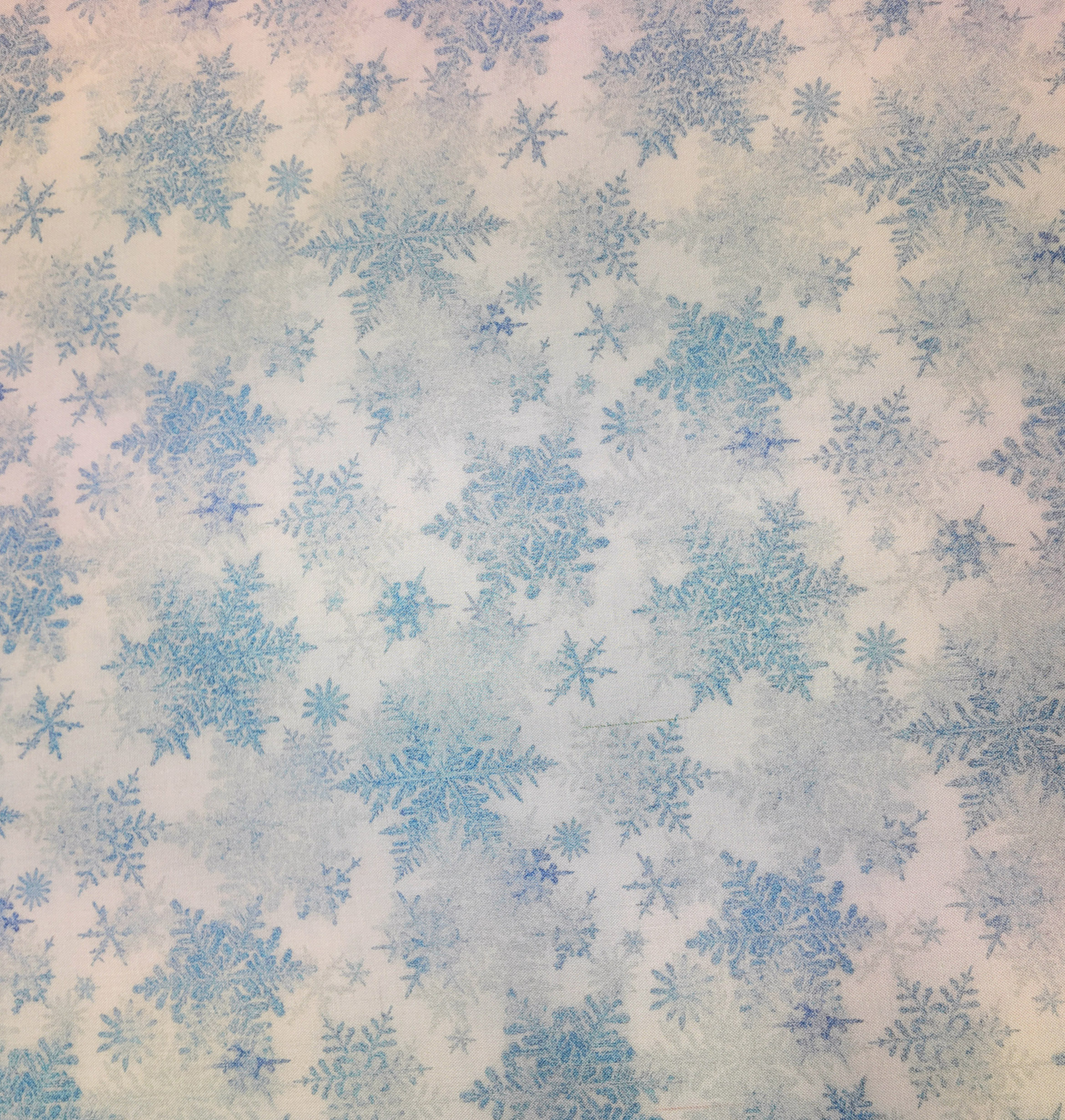 Un voile doux où se posent des flocons d’un bleu glacé. L’effet évoque un matin d’hiver immobile, empreint de pureté et de lumière.