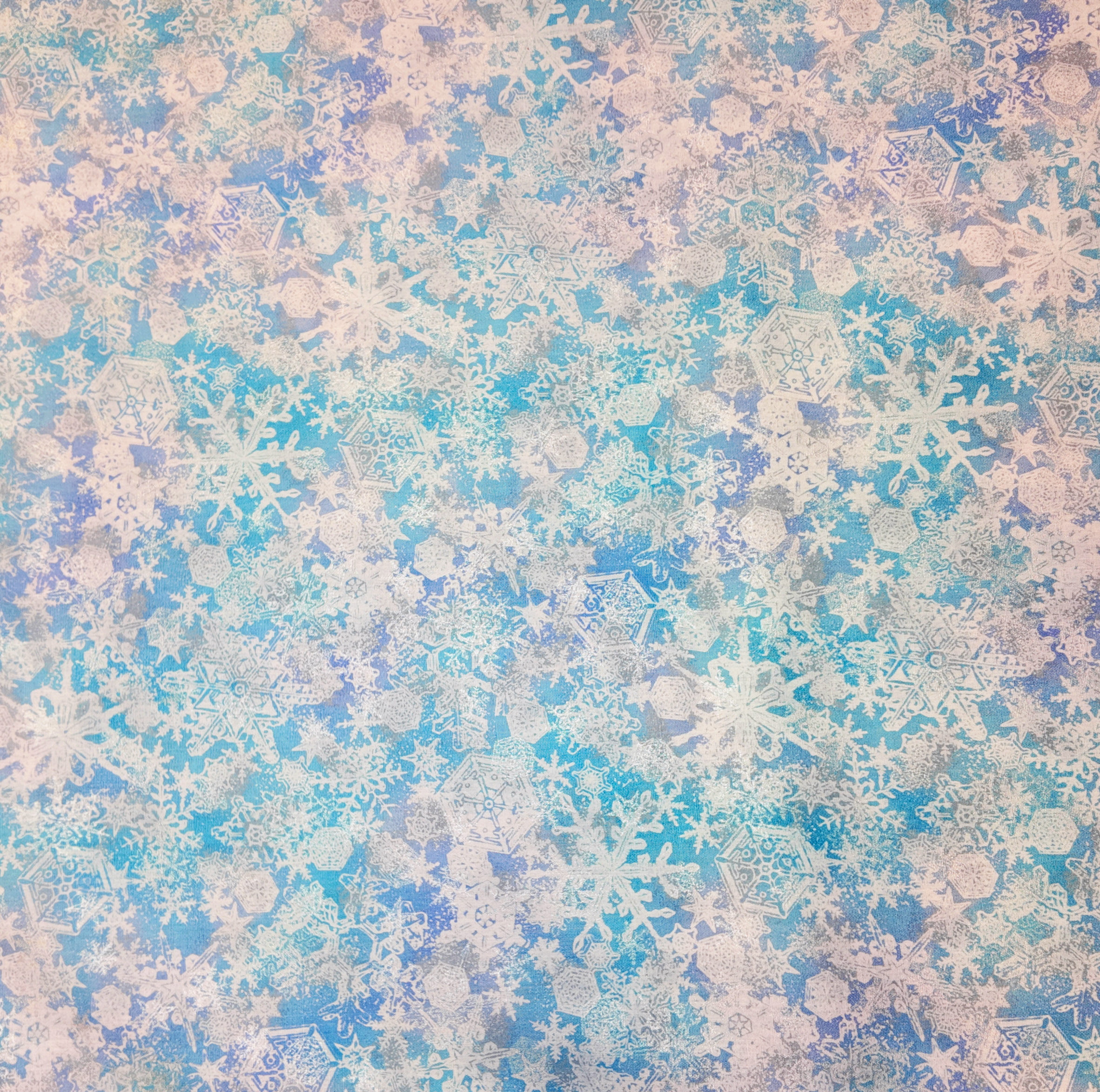 Une pluie de flocons délicats s’étend sur un fond bleuté, léger comme une brume glacée. Ce tissu évoque la sérénité d’un matin d’hiver où la neige étincelle doucement.