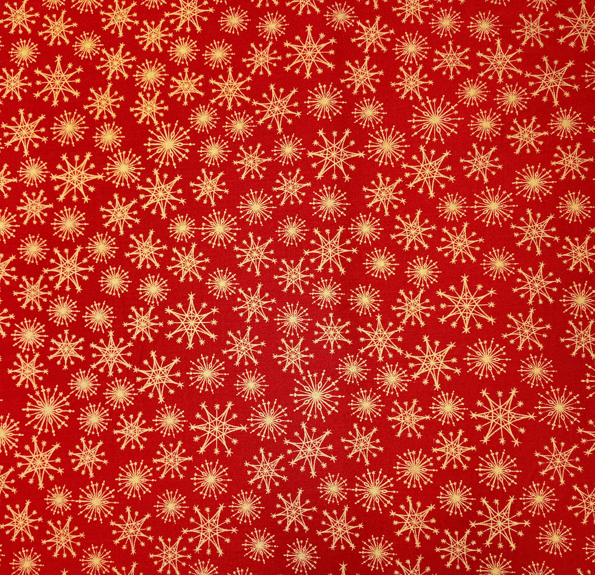 Sur un fond rouge éclatant, des flocons dorés rayonnent comme des étoiles de fête. Ce tissu capture l’esprit étincelant d’un Noël chaleureux et raffiné.